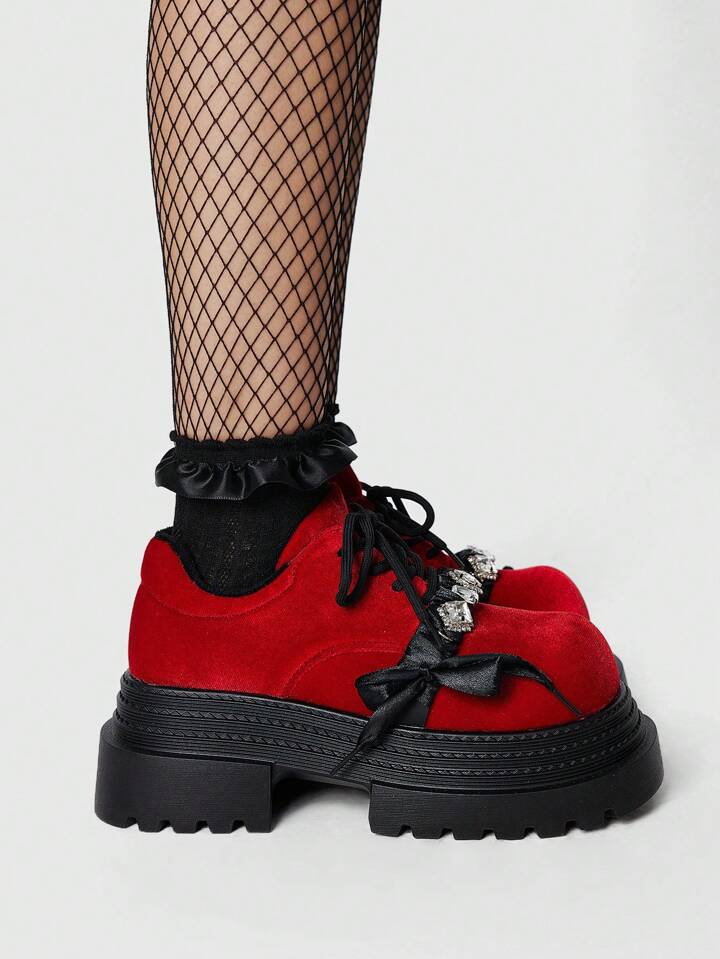 Goth Women's Velvet Casual Low-Top Wedge Sneakers With Rhinestone Decor, Red, Suitable For Daily Walking & Occasions