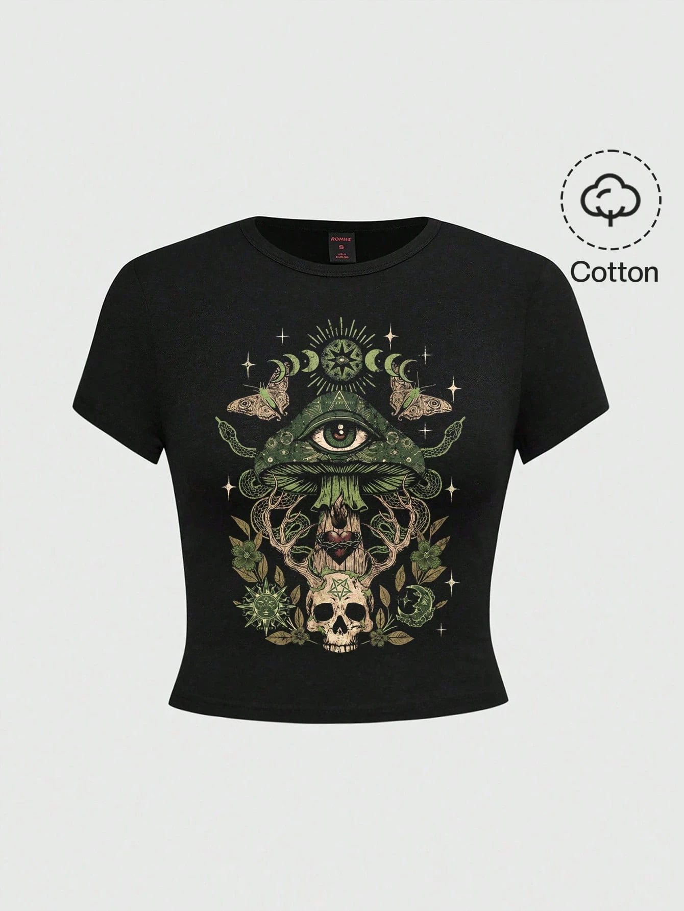 Gothic Botanical Garden Mushroom, Sun, Moon, Stars, Hippie Skull, Mushroom, Bat, Moth, Butterfly, Rose Flower T-Shirt For Women, Suitable For Spring And Summer, Valentine's Day