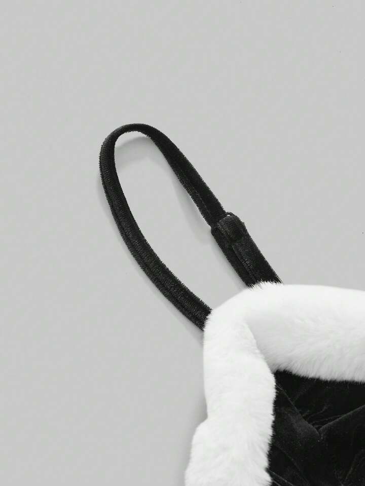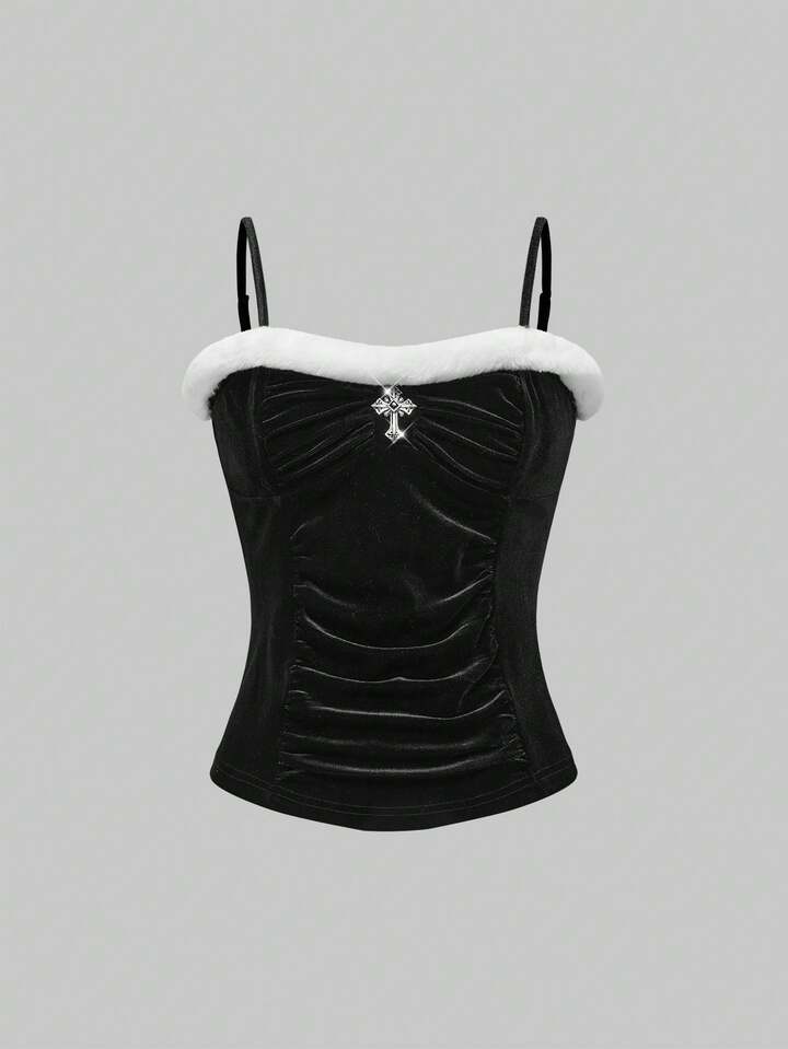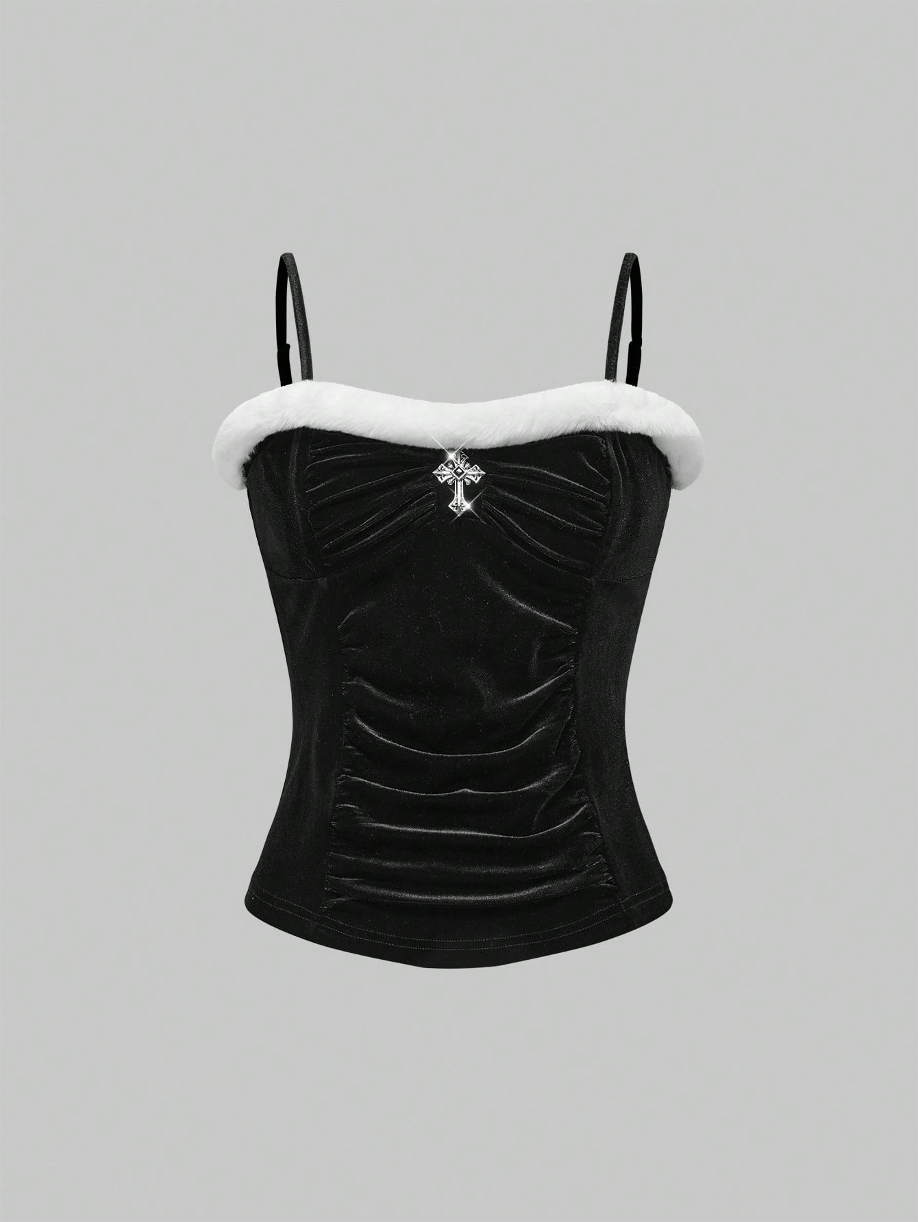 Gothic Christmas Faux Fur Patchwork Cross Metal Pendant Velvet Cami Top