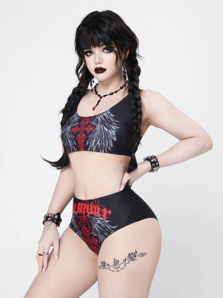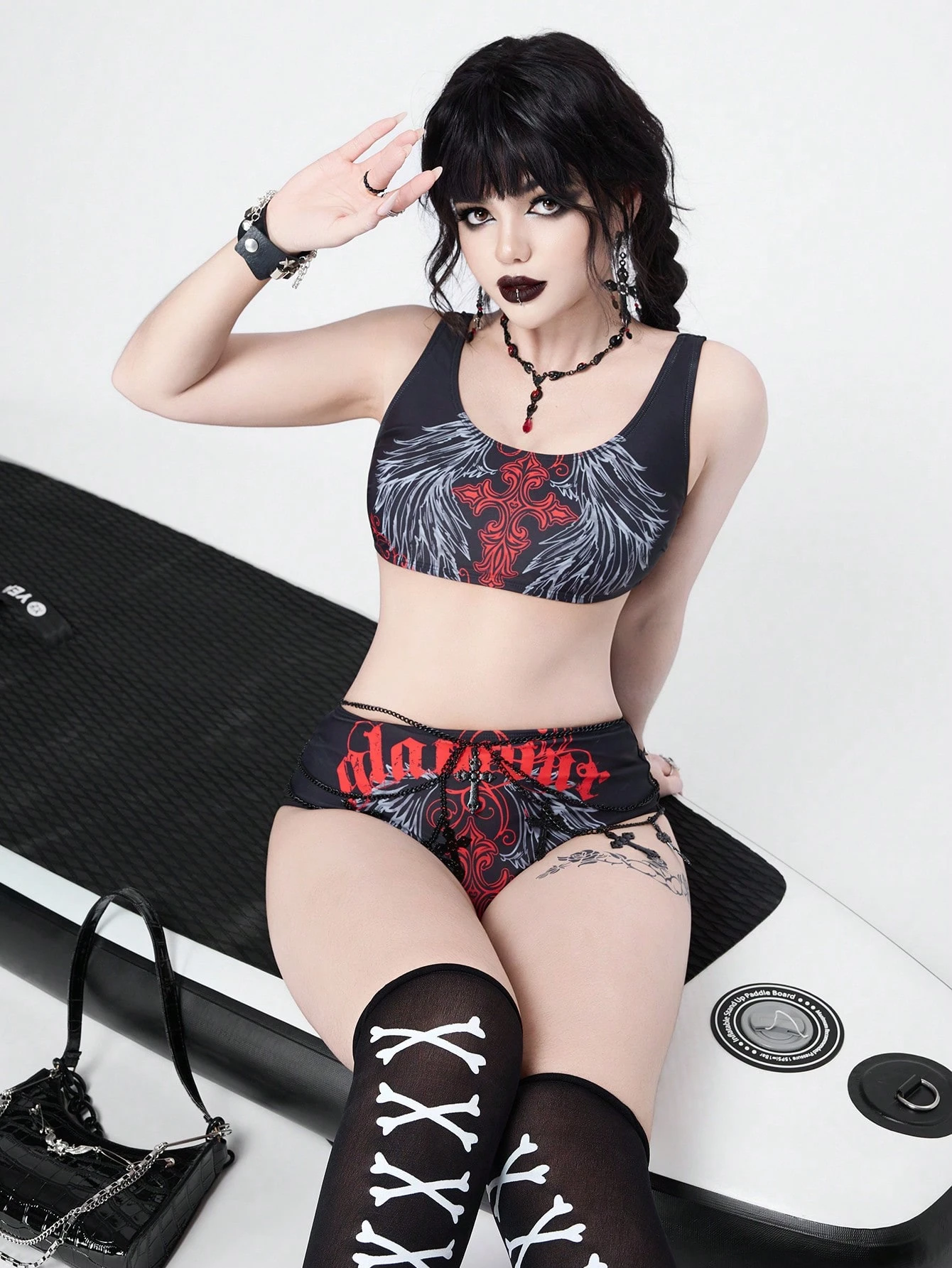 Gothic Cross Angel Wing Print Crop Cami Bikini Set