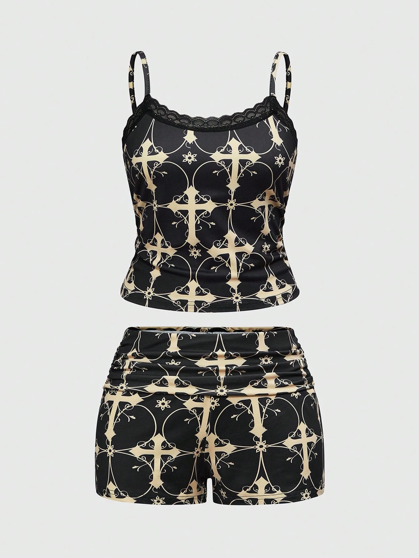 Gothic Cross Pattern Camisole & Shorts Pajama Set, Casual Sleepwear