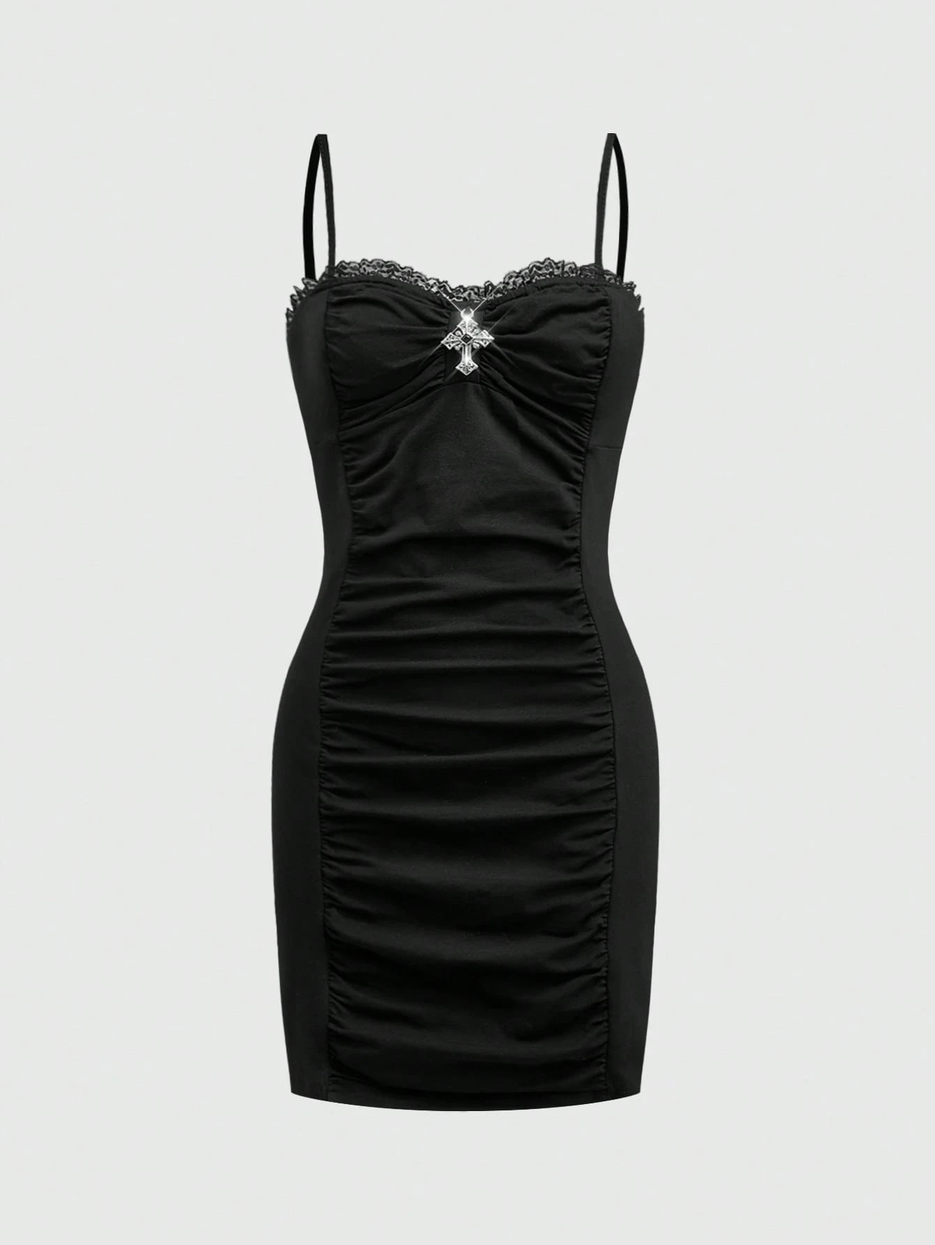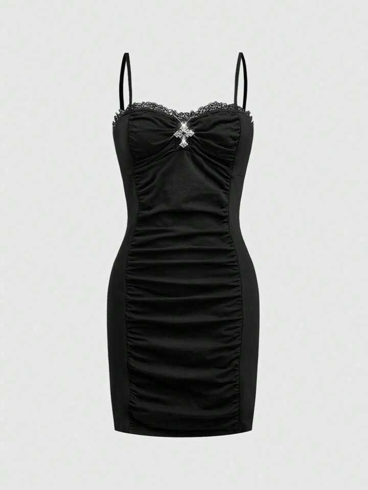 Gothic Cross Pendant Decor Romantic Lace Splicing Ruched Bodycon Mini Dress For Women
