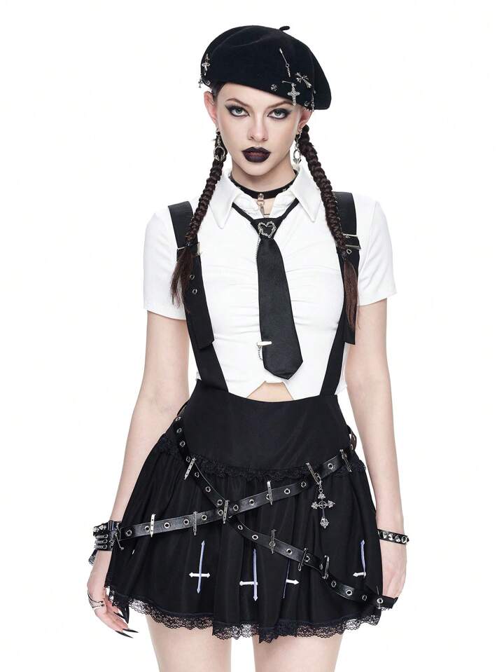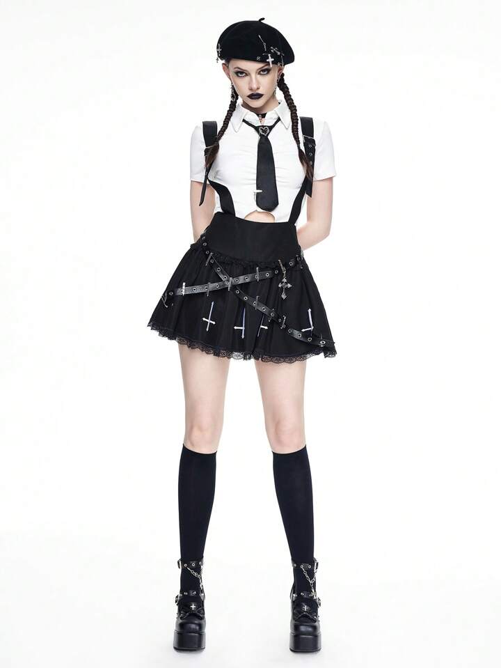 Gothic Cross Pendant Suspender Design With Lace Trim Skirt, Collegiate Style For Women