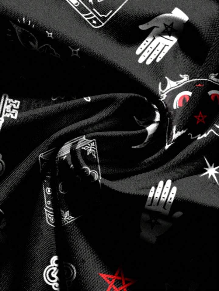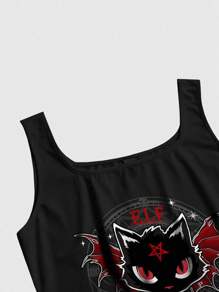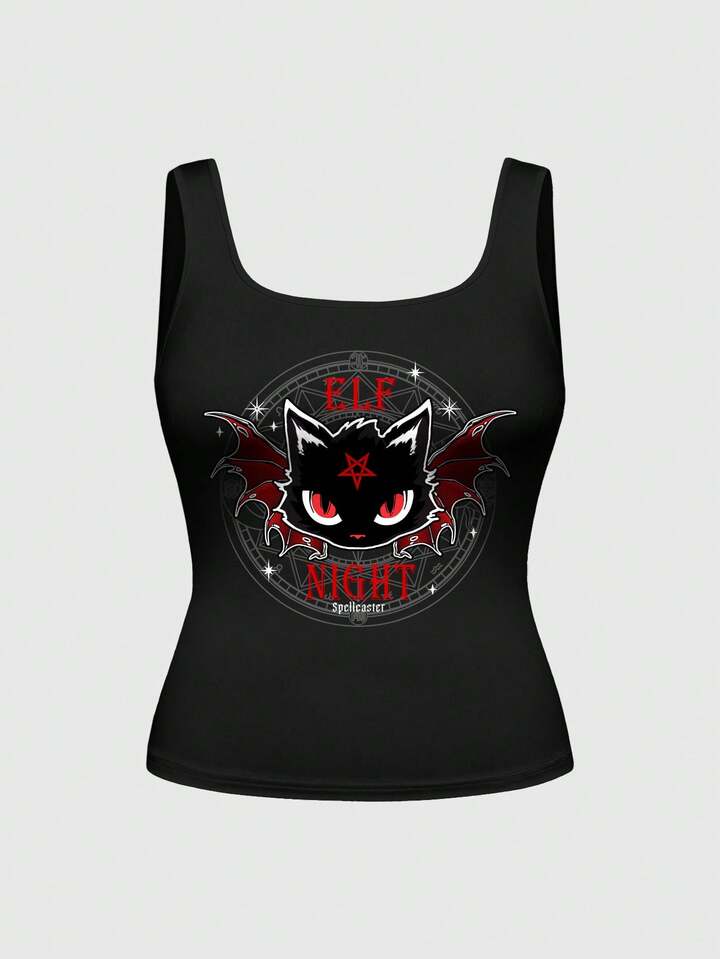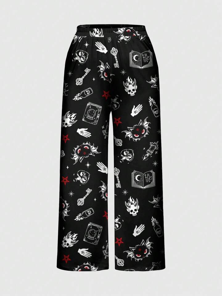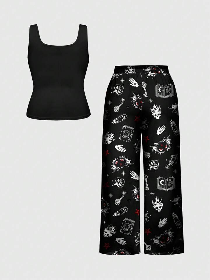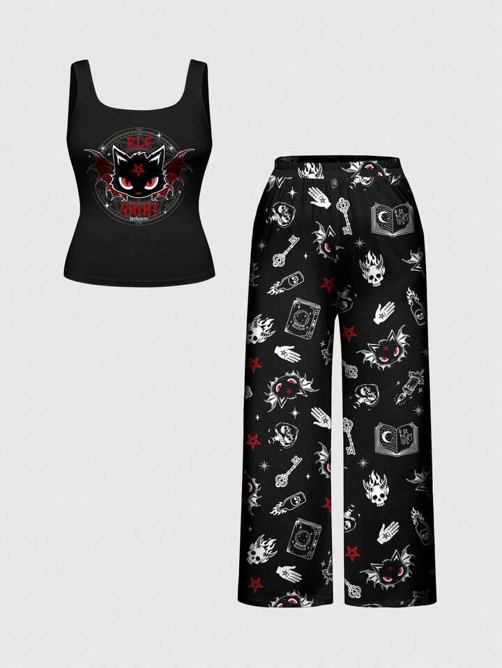 Gothic Dark Demon Elf Cat Starry Magic Book Skull Key Star Plus Size Full Print Tank Top And Pants Pajama Set, Casual Sleepwear
