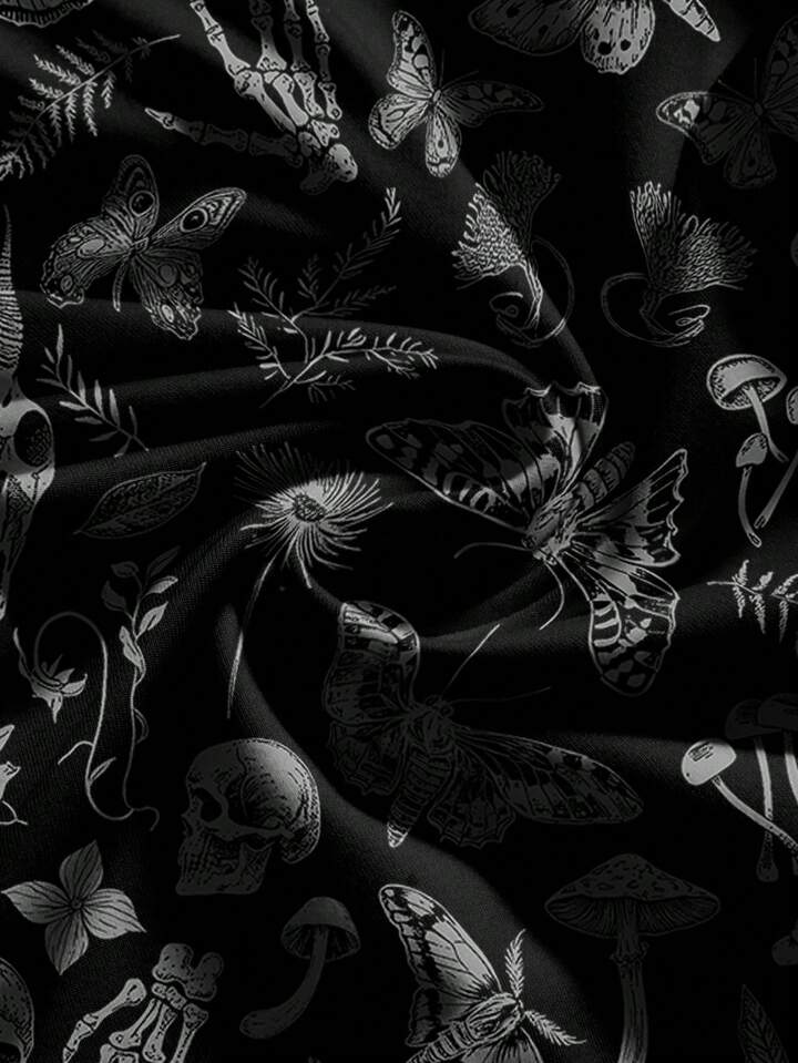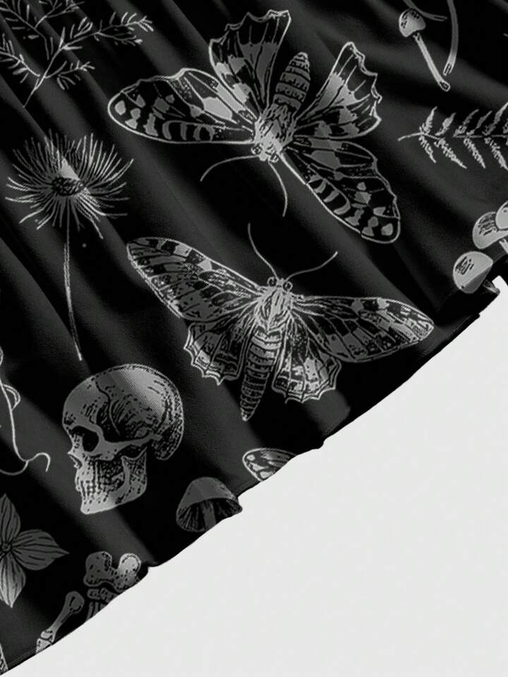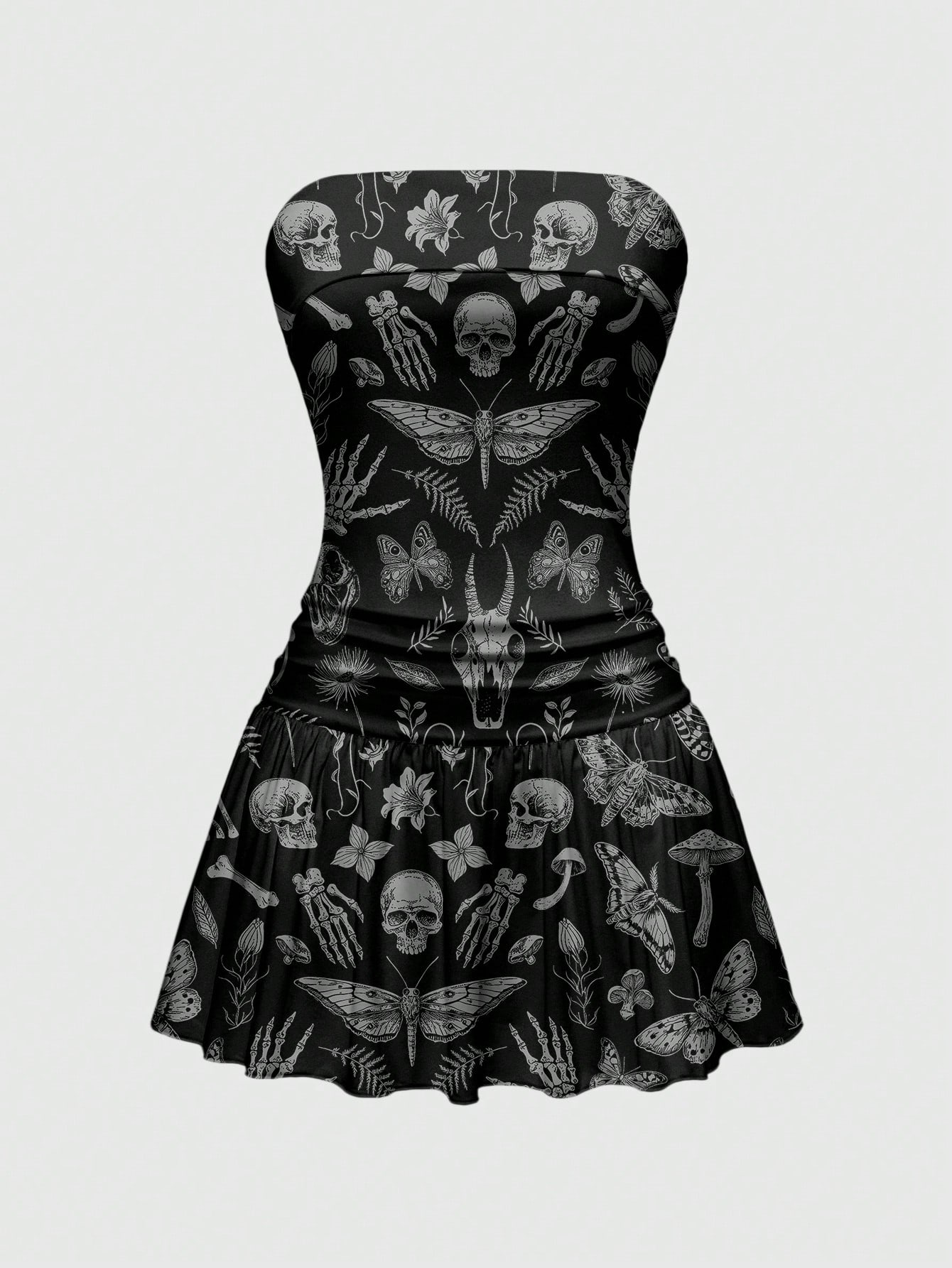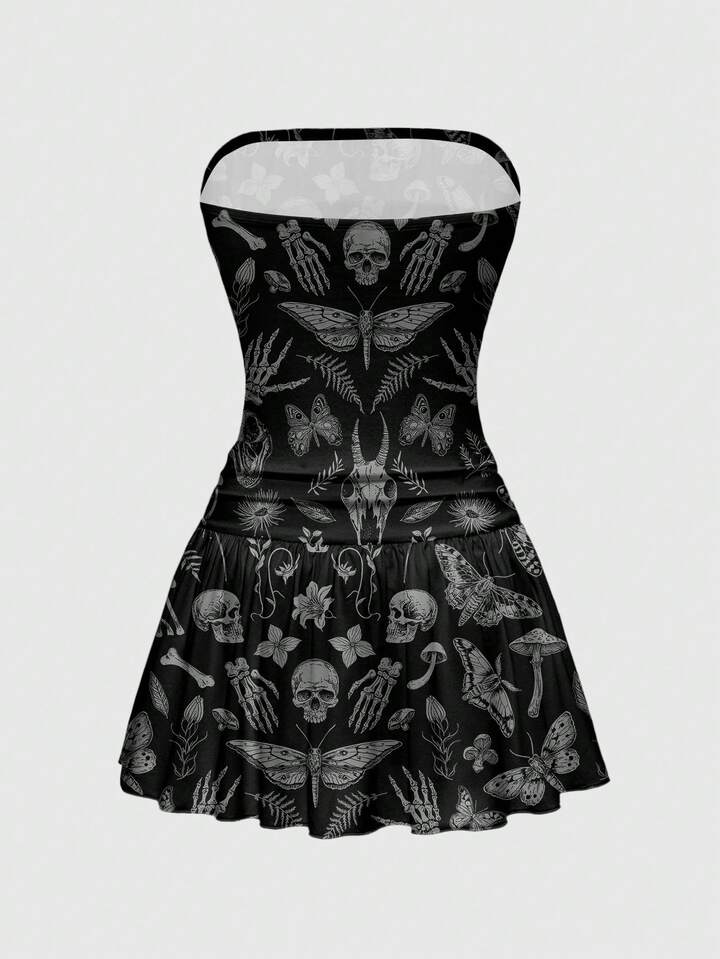 Gothic Dark Goth Skeleton Leaf Plant Nature Sexy Crop Top Elastic Low Waist Ruched A-Line Dress For Women