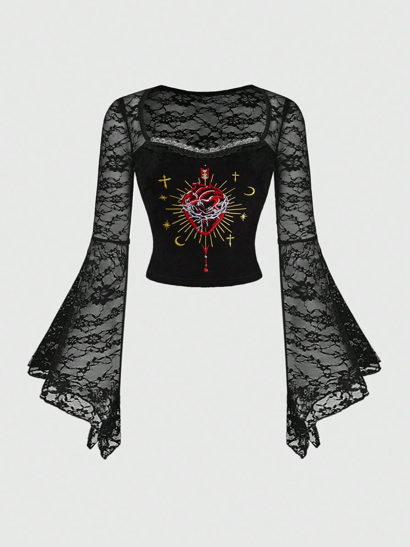 Gothic Dark Red Heart Embroidery Velvet Contrast Lace Ribbon Tie Hem Patchwork Mesh Women Fitted Blouse With Oversized Sleeves