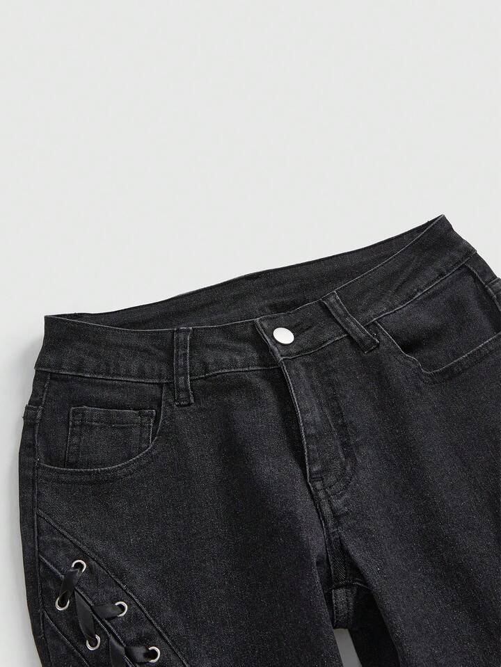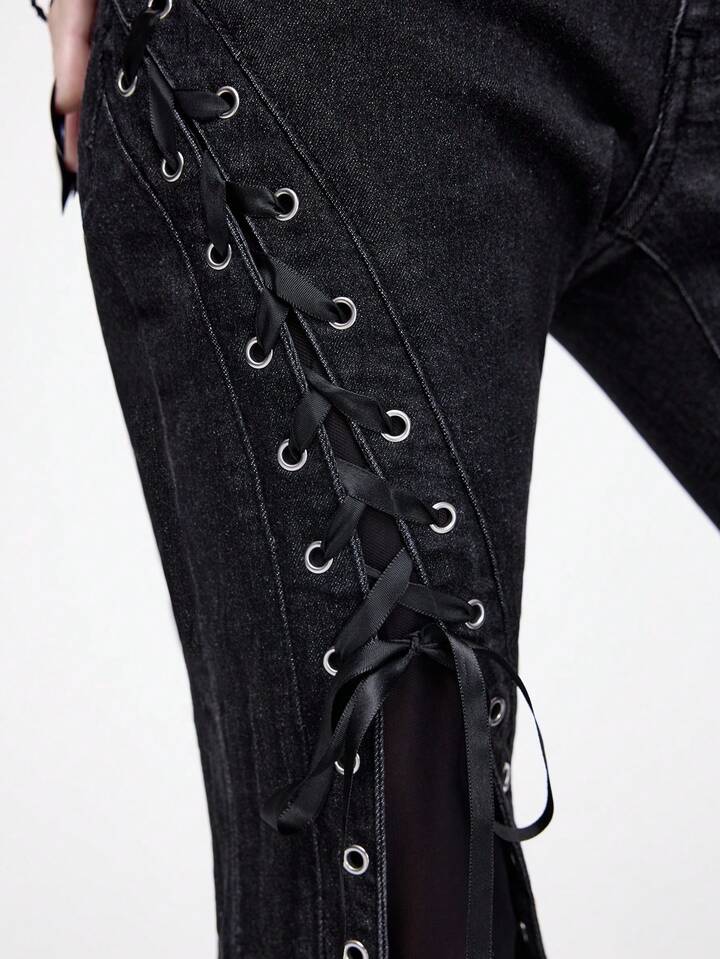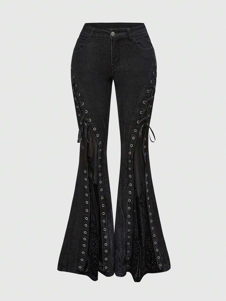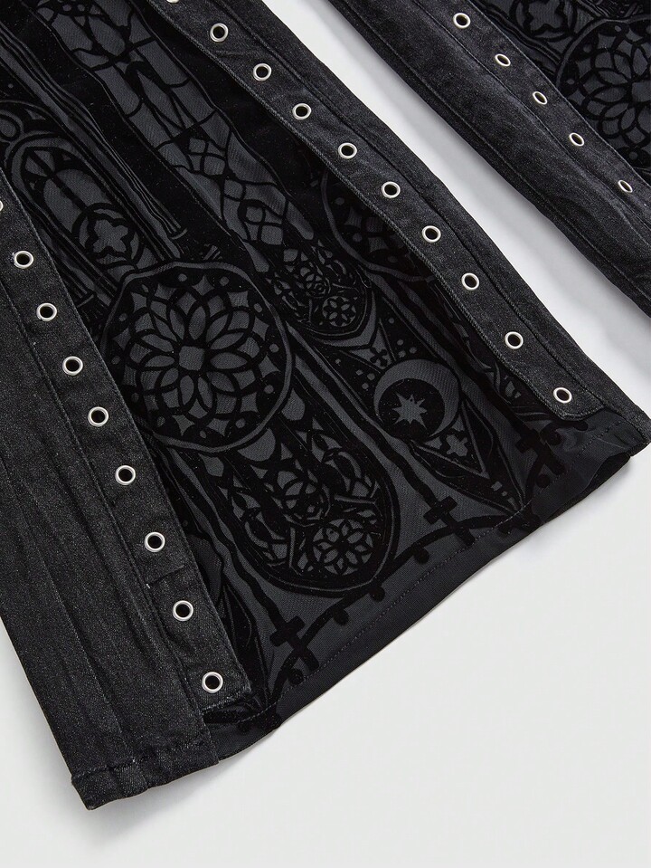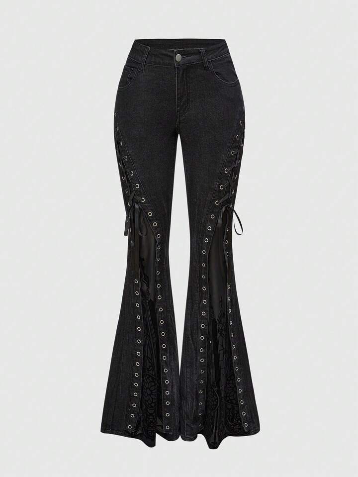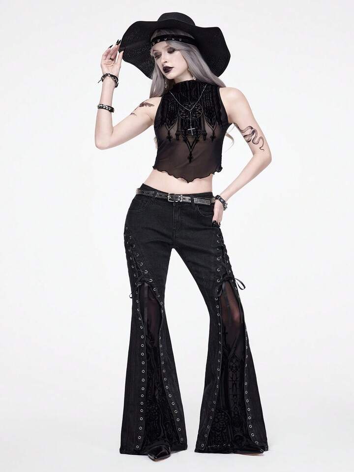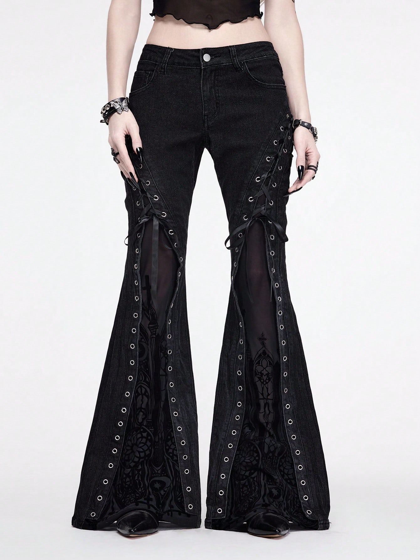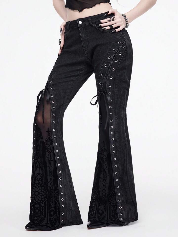 Gothic Dark Style Halloween Palace Castle Flocking Patchwork Eyelet Super Low Waist Flare Leg Jeans