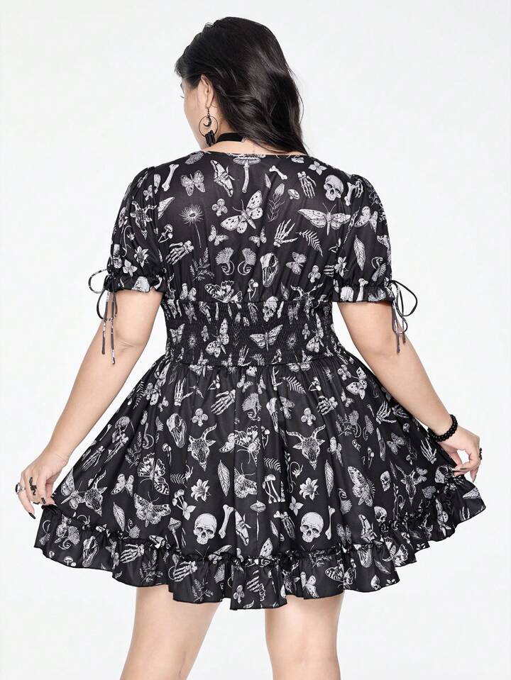 Gothic Floral Skull Print Puff Sleeve Lolita Dress, Plus Size