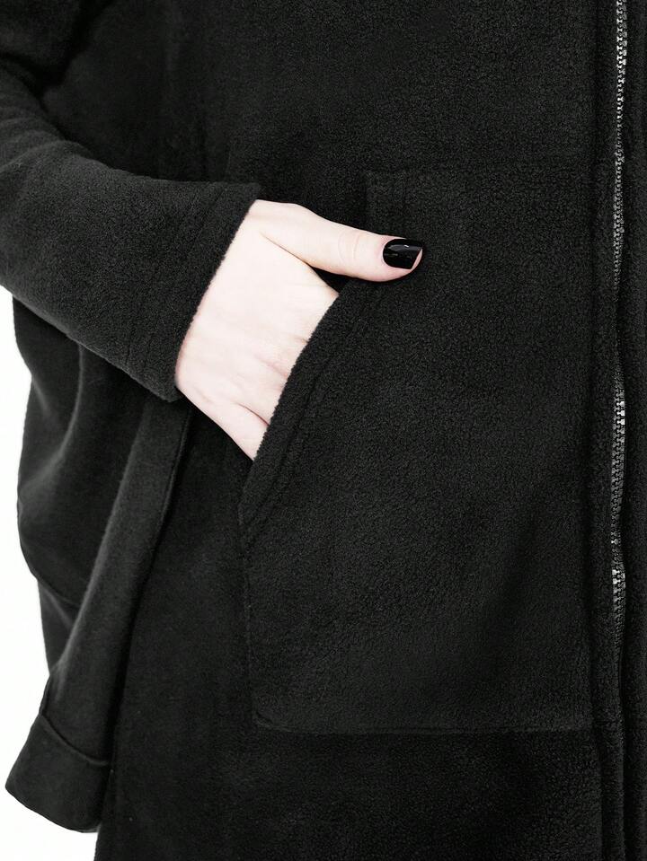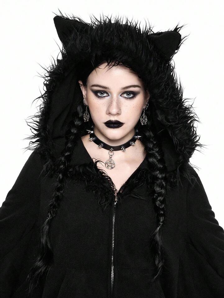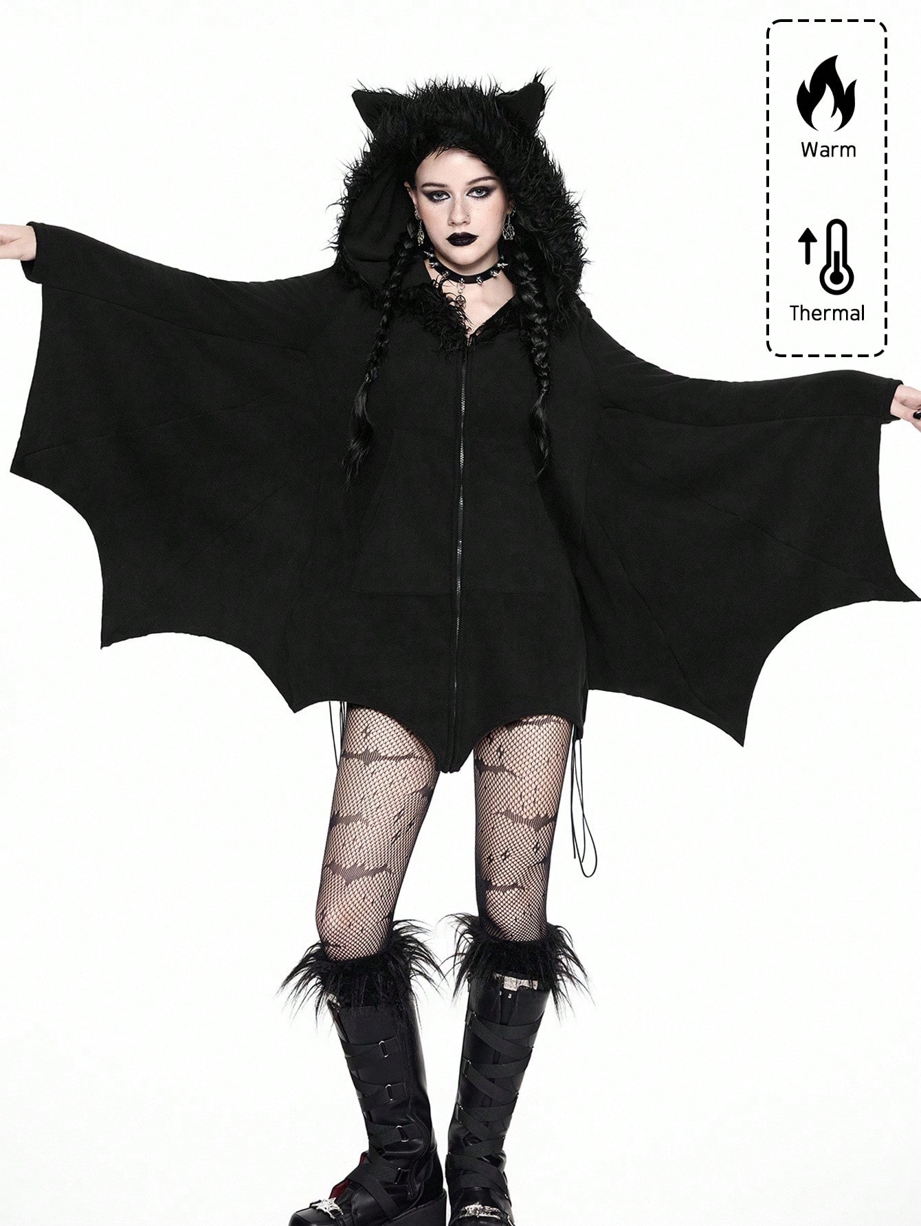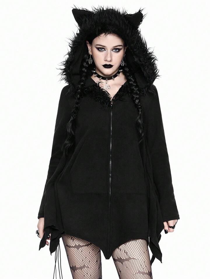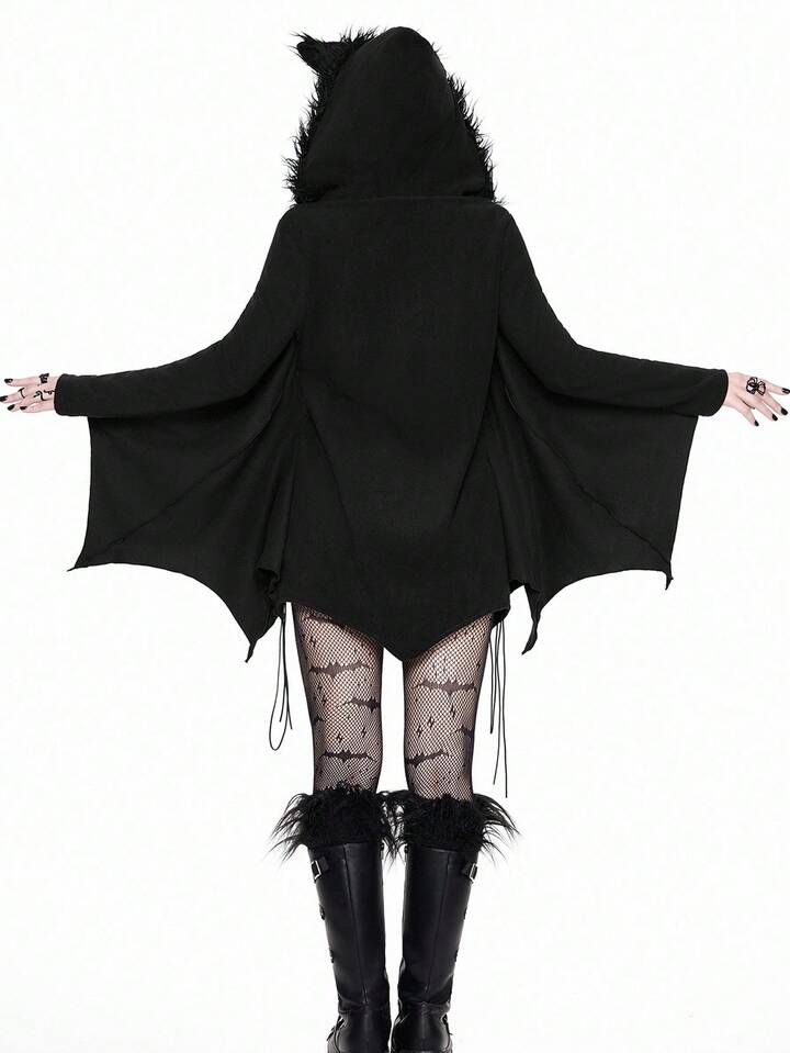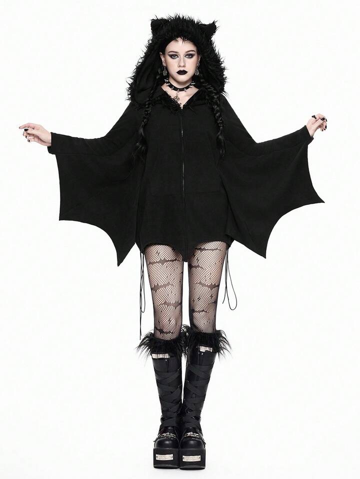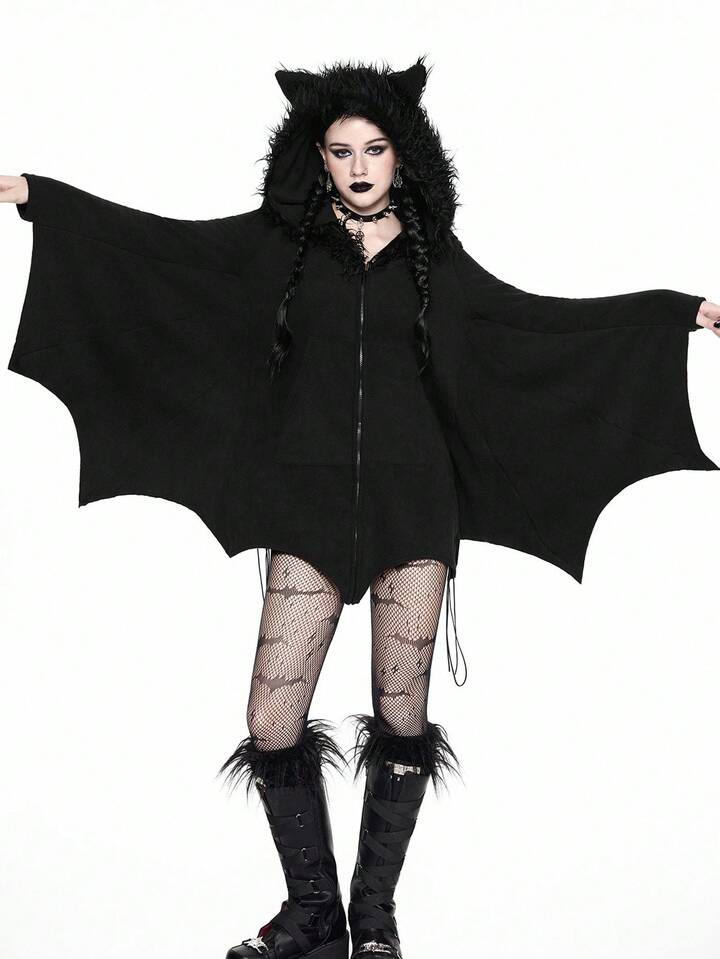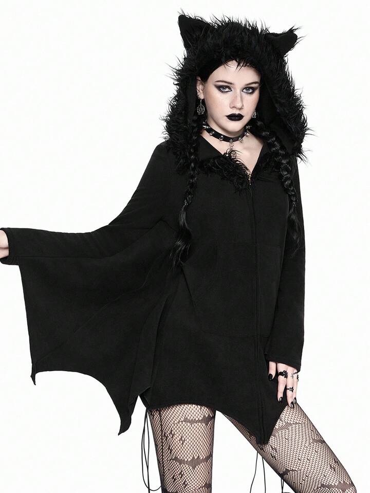 Gothic Furry Patchwork Bat Design Hoodie Sweatshirt For Women, Fuzzy Fleece Zip-Up Sweatshirt, Halloween