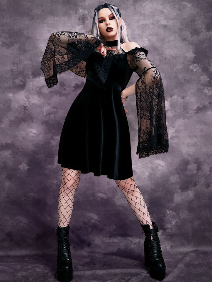Gothic Lightweight Contrast Lace Split Sleeve Cold Shoulder Mesh Dress