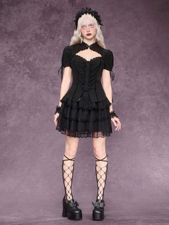 Gothic Lolita Lace Patchwork Puff Sleeve Blouse For Women, Adjustable Drawstring