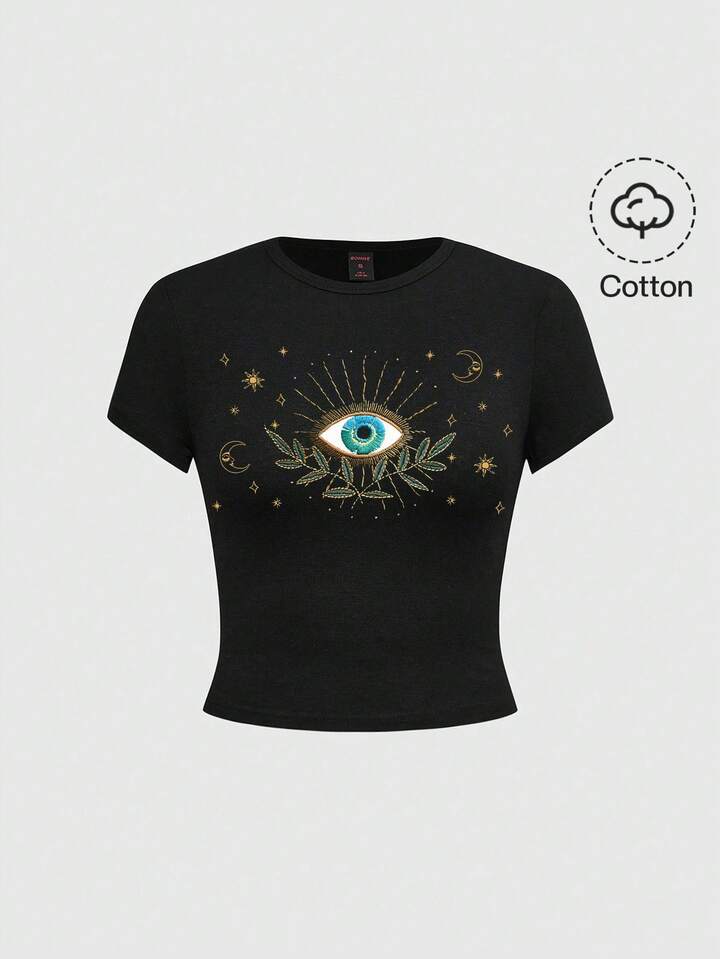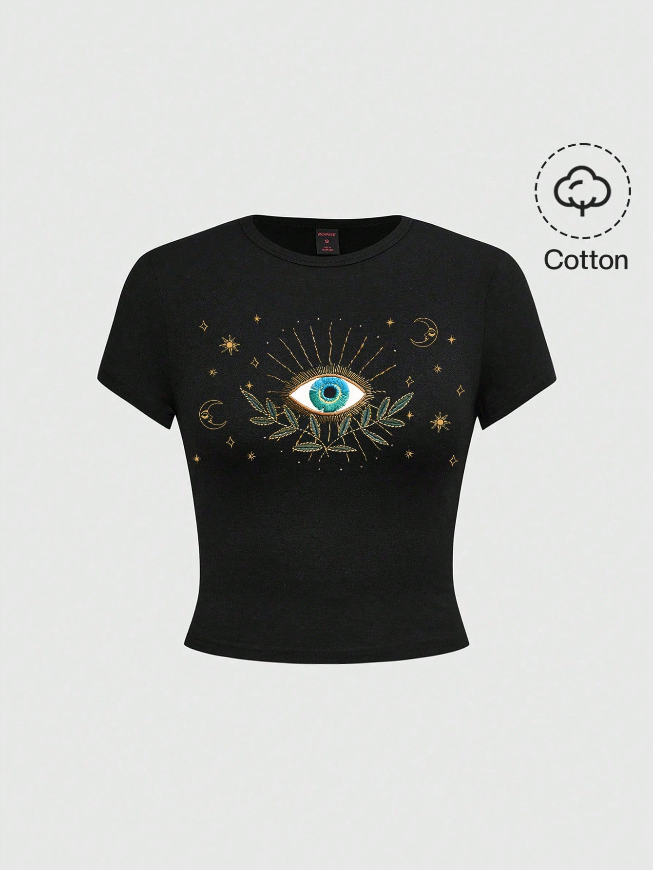 Gothic Mysterious Eye, Sun And Moon Print Black T-Shirt For Women