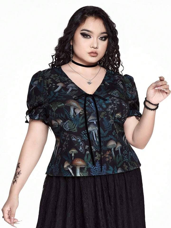 Gothic Mysterious Mushroom & Floral Full Print V-Neck Puff Sleeve Plus Size Shirt For Summer
