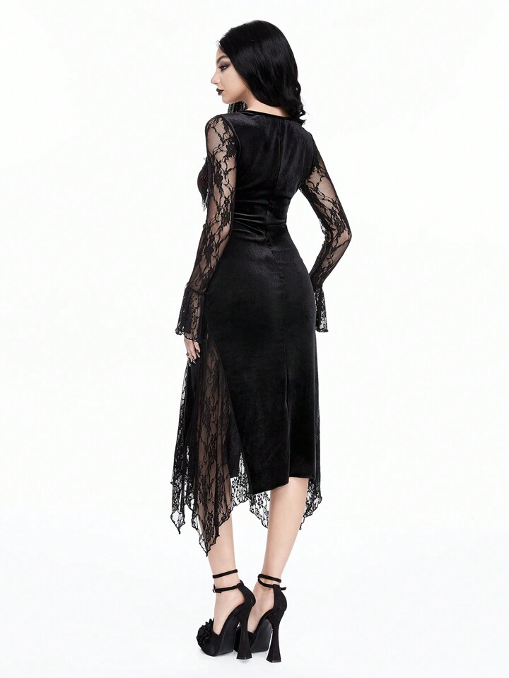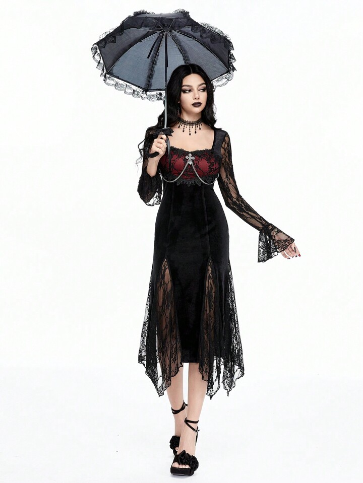Gothic Palace Style Sexy Contrast Lace V-Neck Pendant Cross Chain High Slit Dress For Women, Halloween Clothes