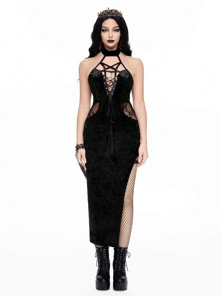 Gothic Palace-Style Sexy V-Neck Star Decor Waist Lace Patchwork Thigh High Slit Velvet Dress For Women