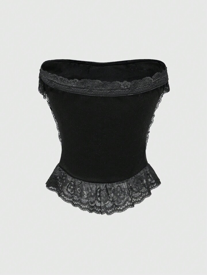 Gothic Palace Style Vintage Bandeau Lace Patchwork Cross Velvet Bustier Top, Plus Size Women