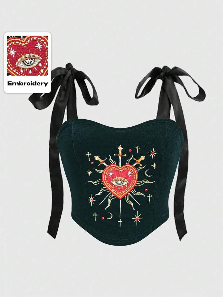 Gothic Palace Style Women Summer, Heart & Rhinestone Embroidery Teardrop Crystal Jewel Square Neck Black Crop Top