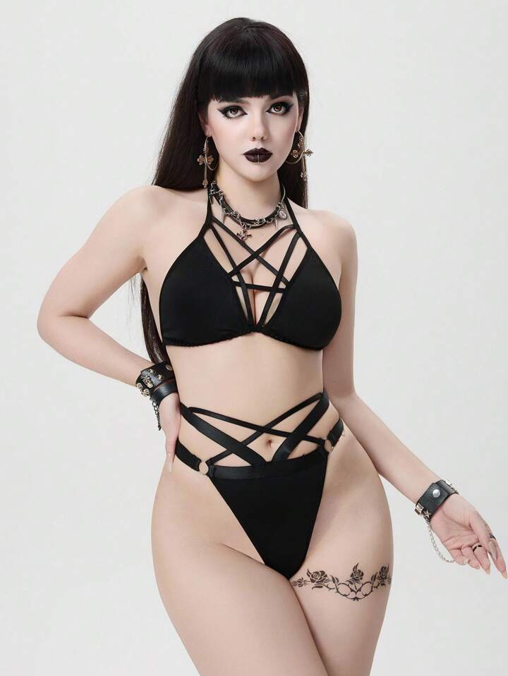 Gothic Pentagram Tied Bralette And G-String Lingerie Set