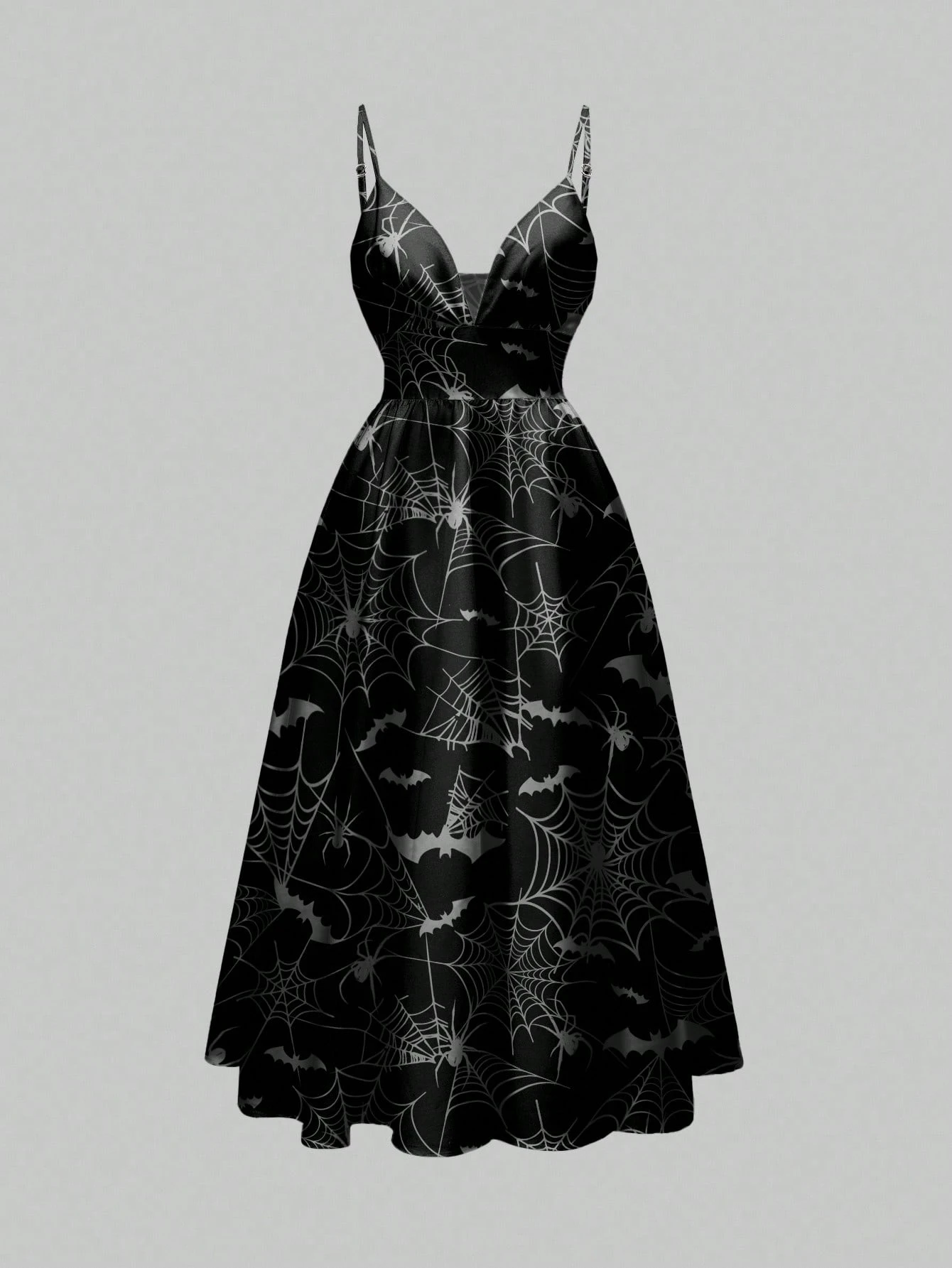 Gothic Romantic Forest Style Halloween Spider Web & Bat Print Sexy Spaghetti Strap Low-Cut Dress For Women