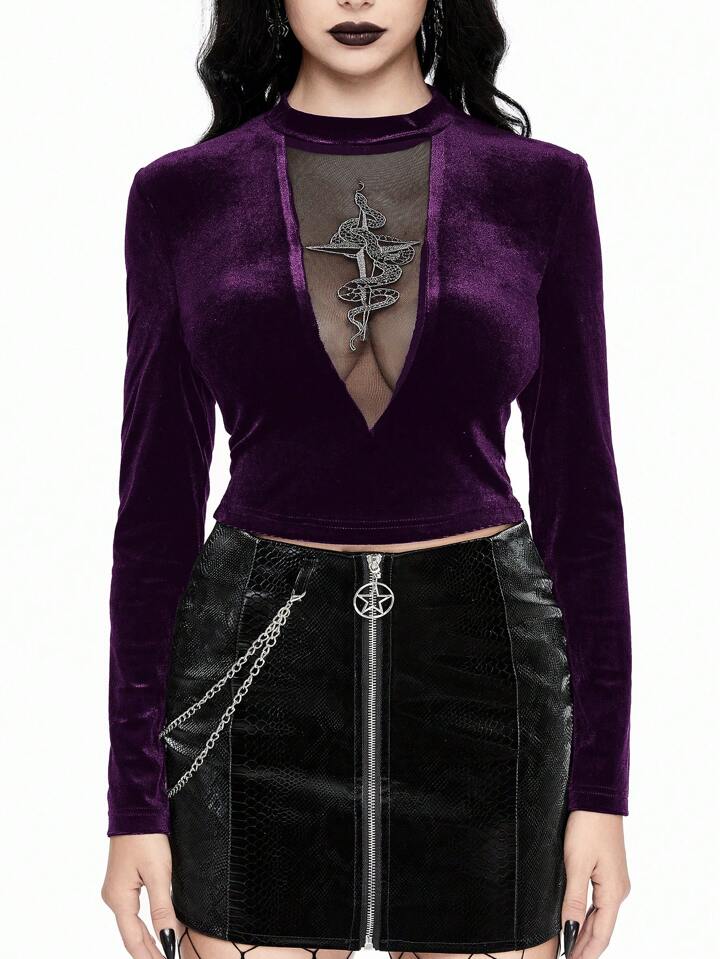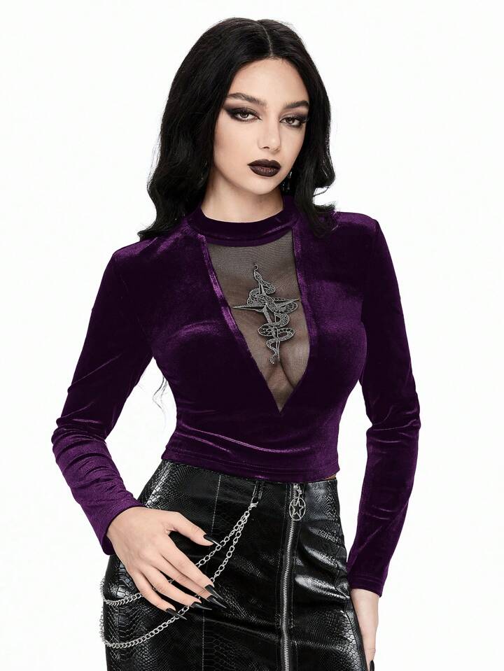Gothic Sexy Snake Embroidered Hollow Out Front Women T-Shirt