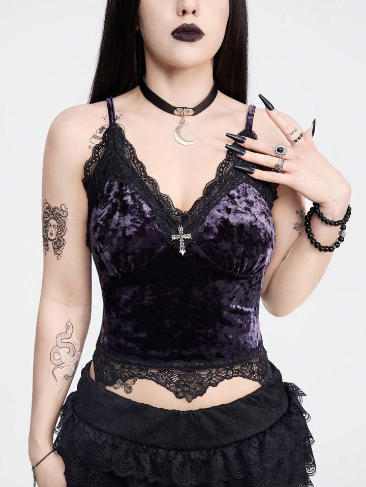Gothic Sexy Tight-Fitting Cropped Women Camisole Top With Lace Trim And Metal Cross