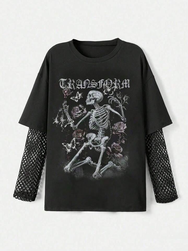 Gothic Skull & Plant Print Mesh Contrast Plus Size Loose T-Shirt For Women