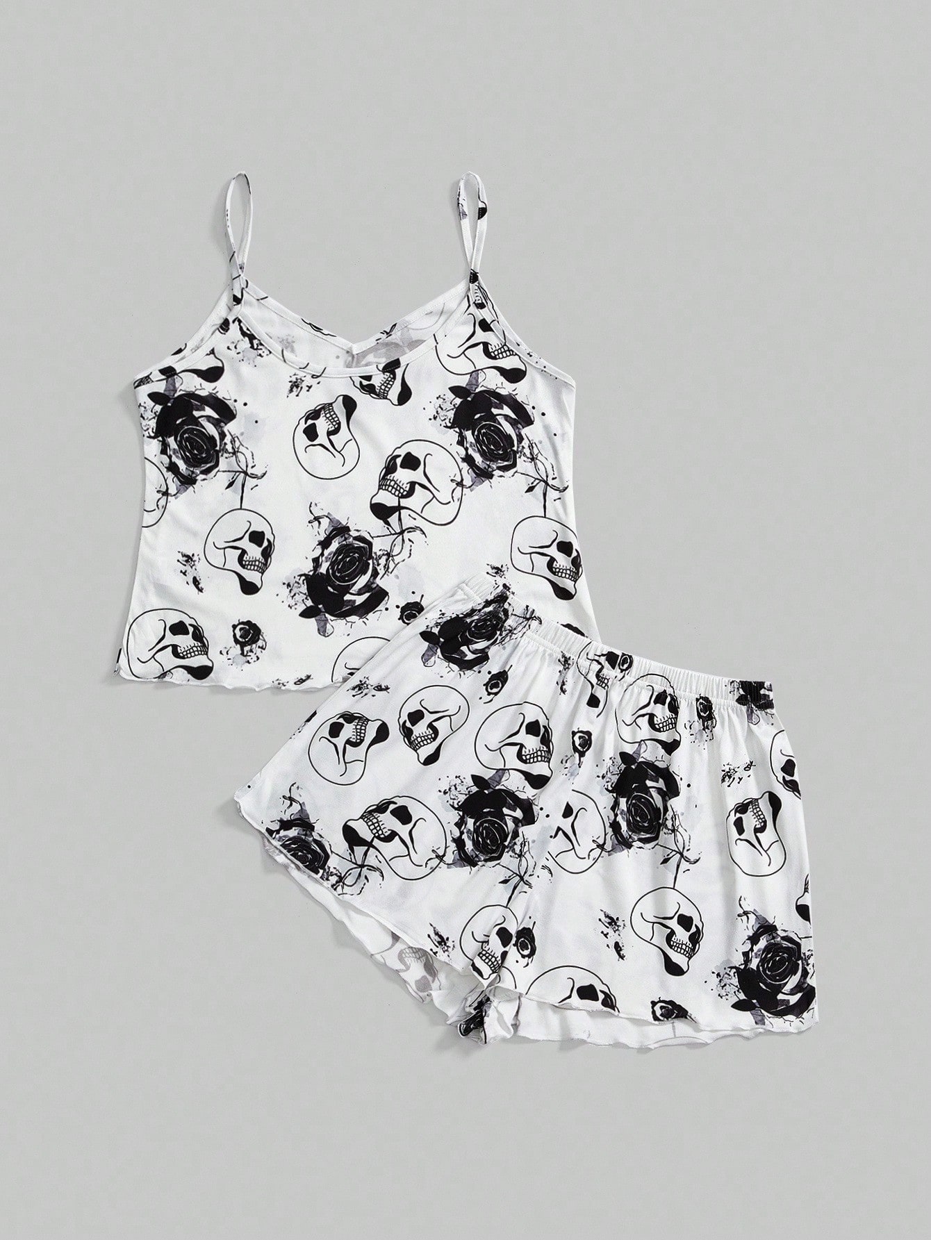 Gothic Skull & Rose Print Satin Camisole & Shorts Pajama Set, Halloween