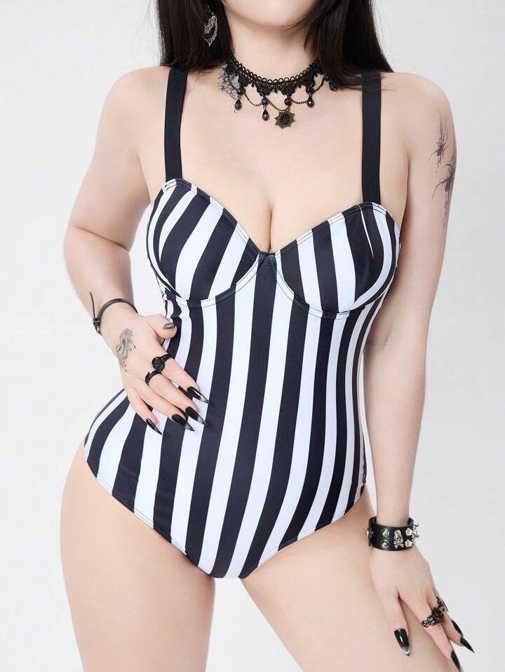 Gothic Striped Print Push-Up Underwire One-Piece Swimsuit, Halloween