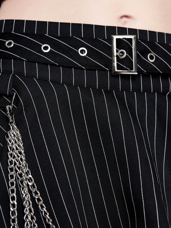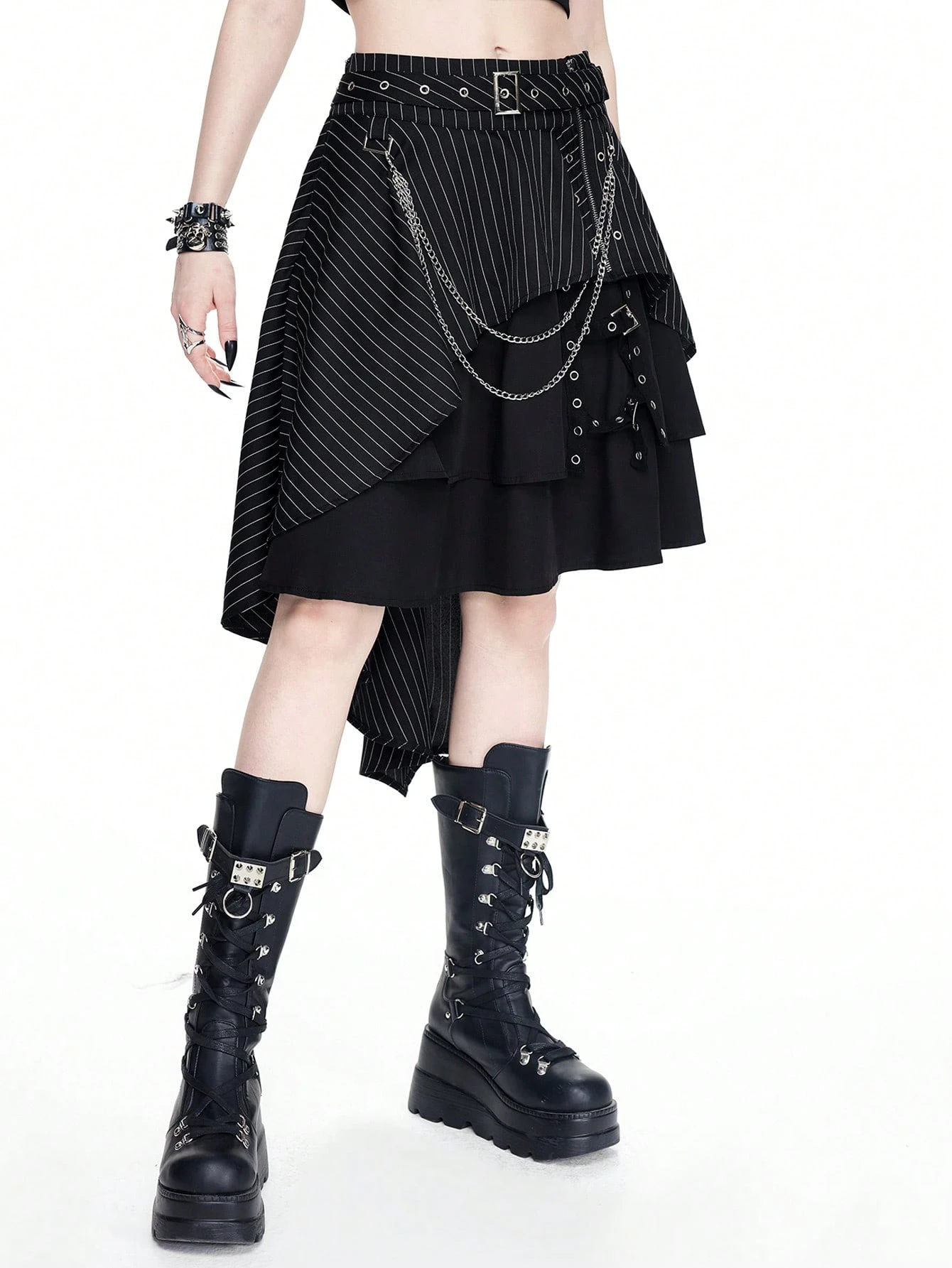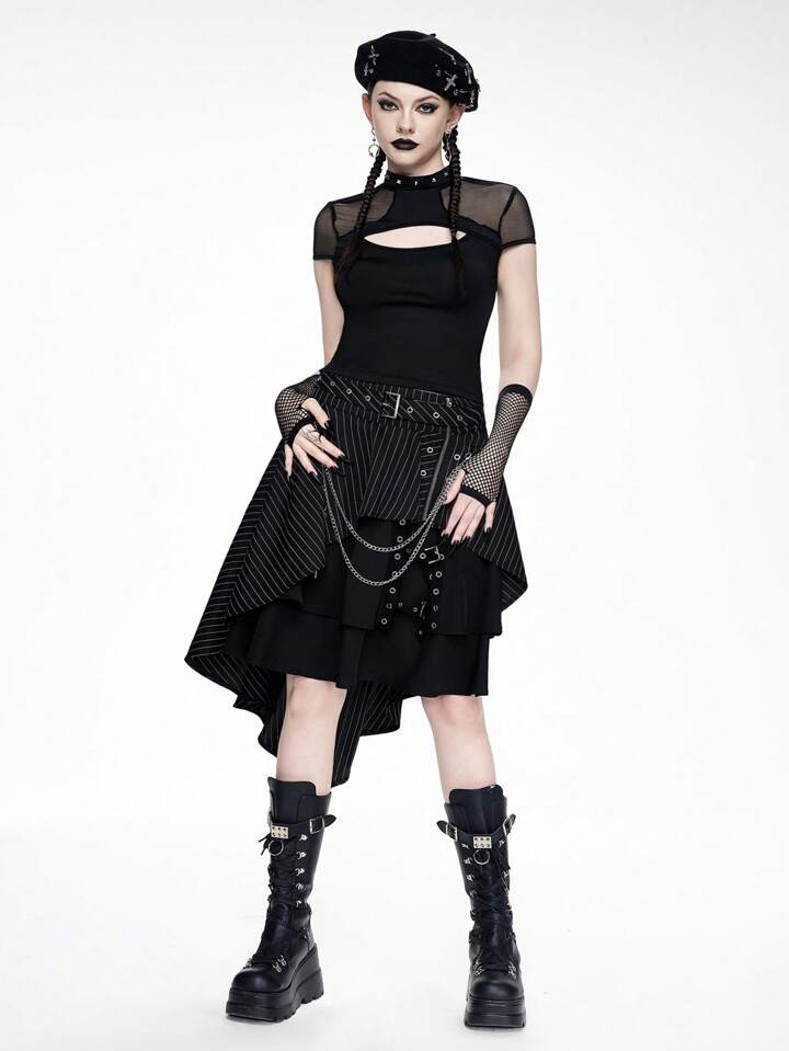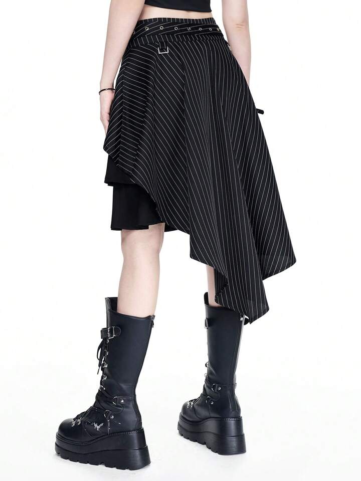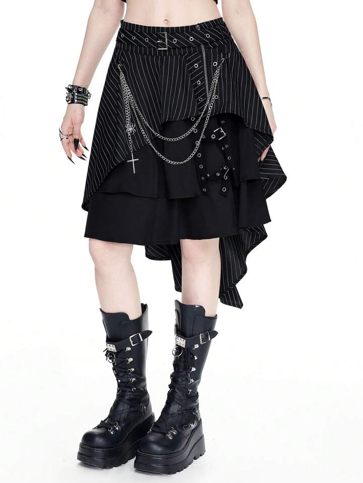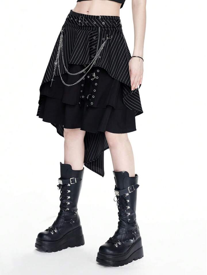 Gothic Style Asymmetric Striped Design Eyelets Metal Cross Chain A-Line Skirt