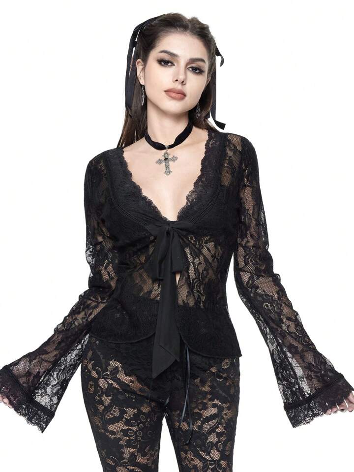 Gothic Style Lace Tie-Front Bowknot Cropped Top , Sexy For Spring Ladies