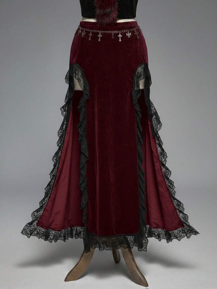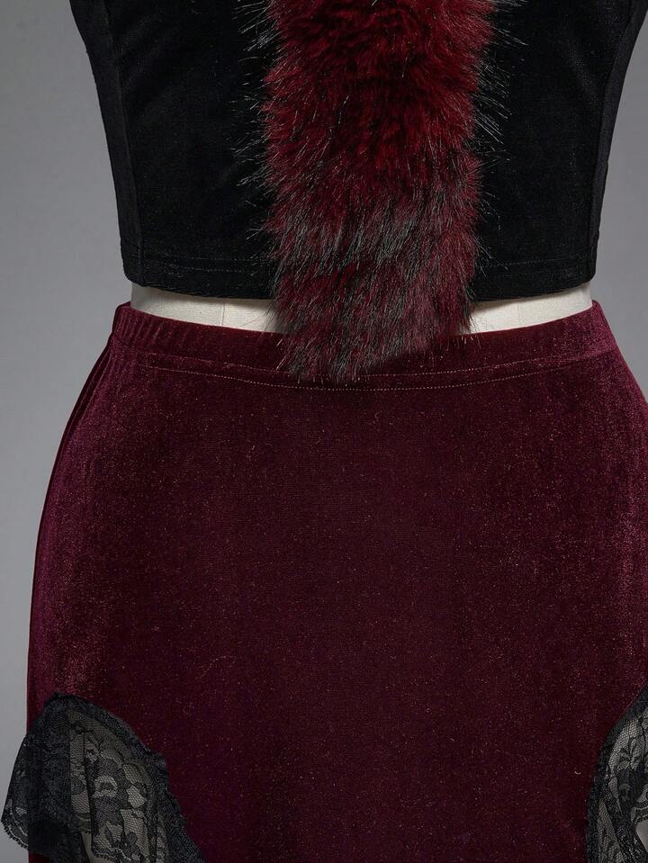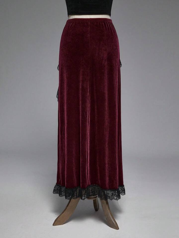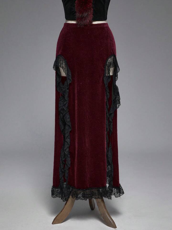 Gothic Style Sexy High Slit Lace & Velvet Patchwork Women's Skirt