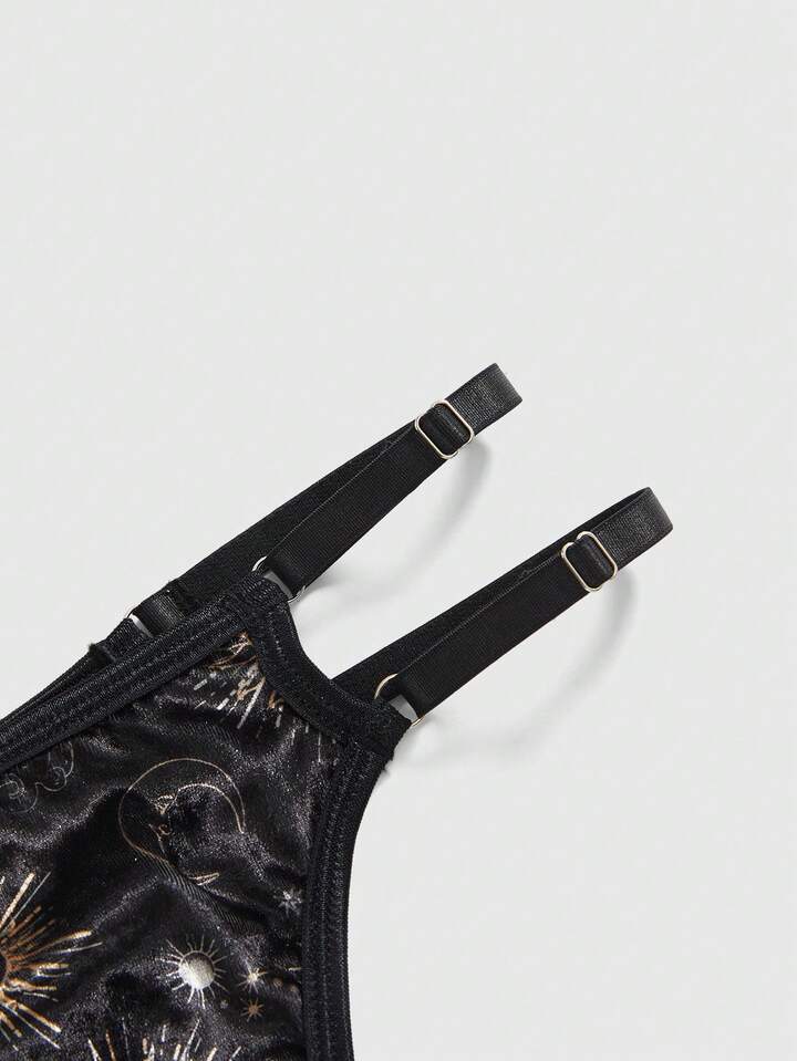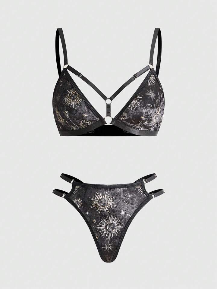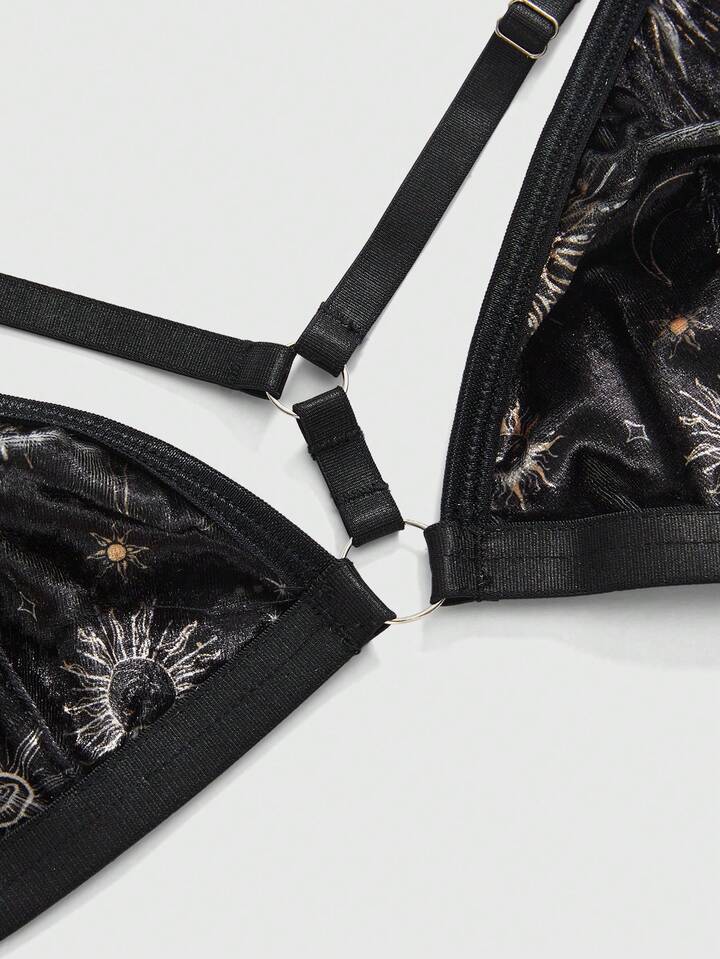 Gothic Sun & Moon Star Velvet Bralette And Thong Lingerie Set