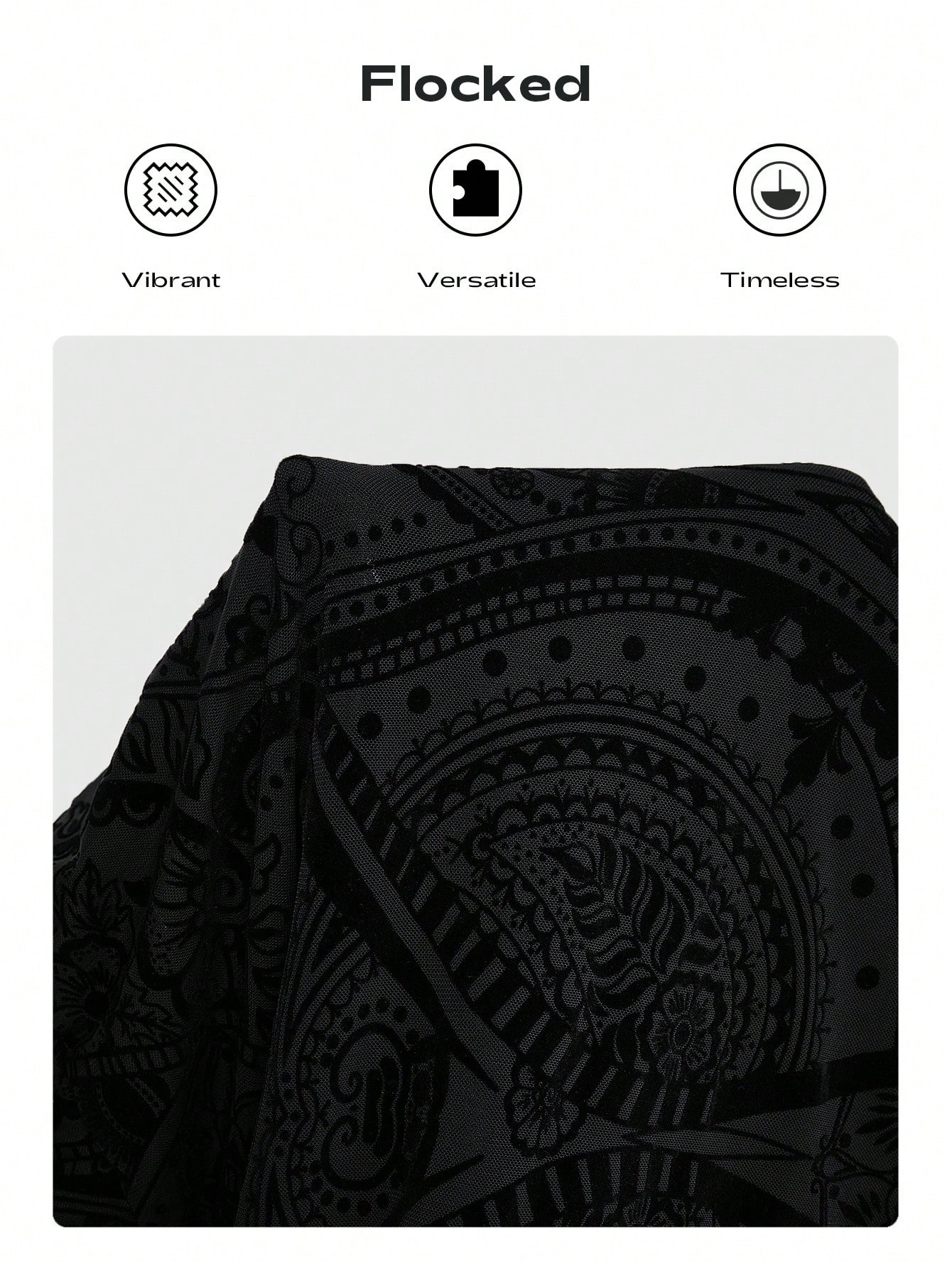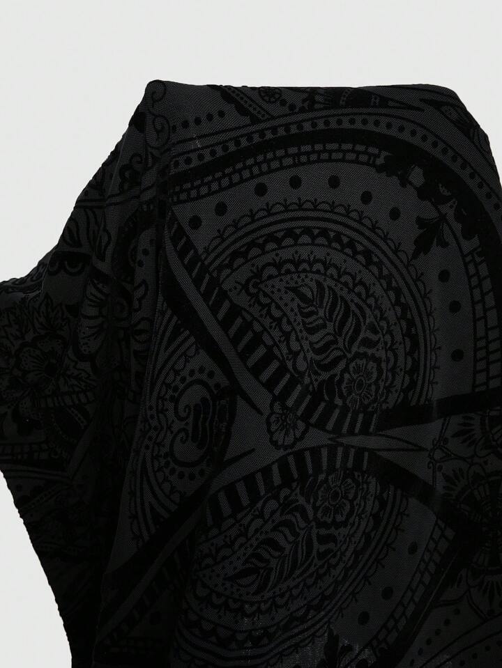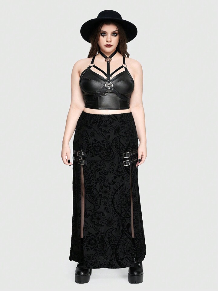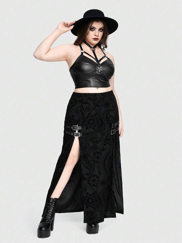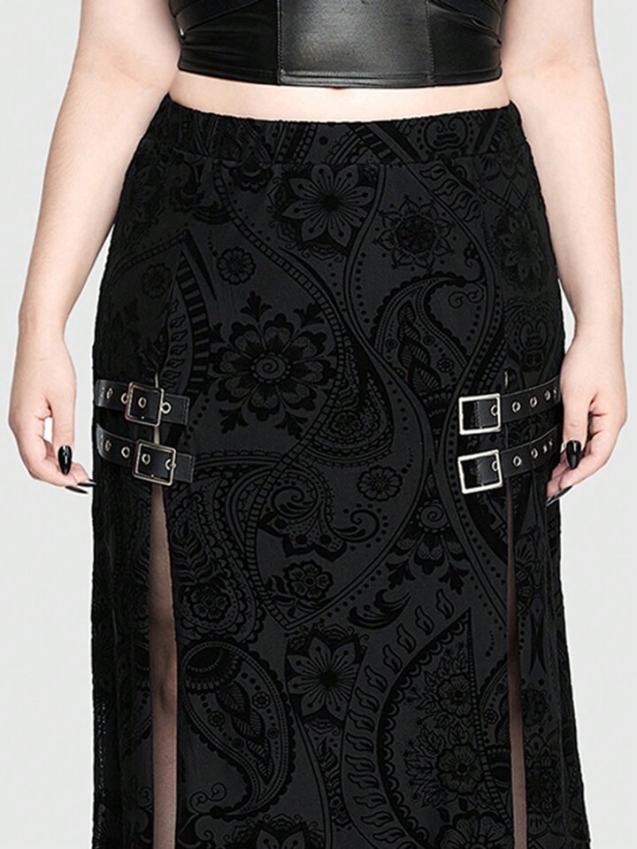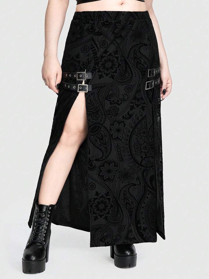 Gothic Thigh High Double Slit Flocked Fabric Metallic Embellished Plus Size Women's Skirt