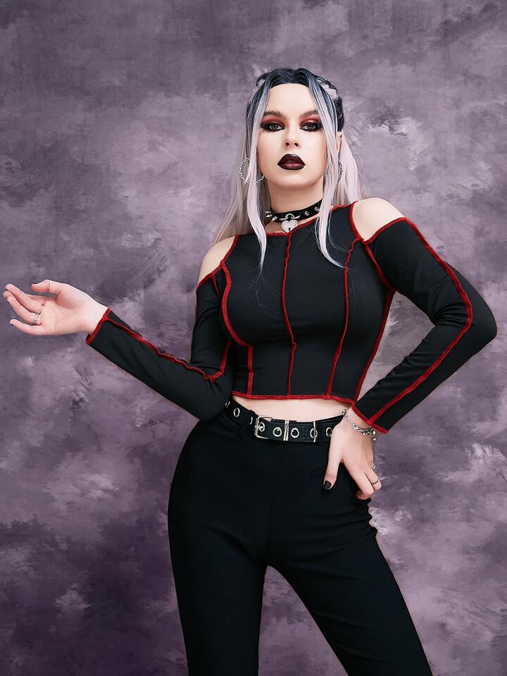 Gothic Top-stitching Cold Shoulder Crop Tee