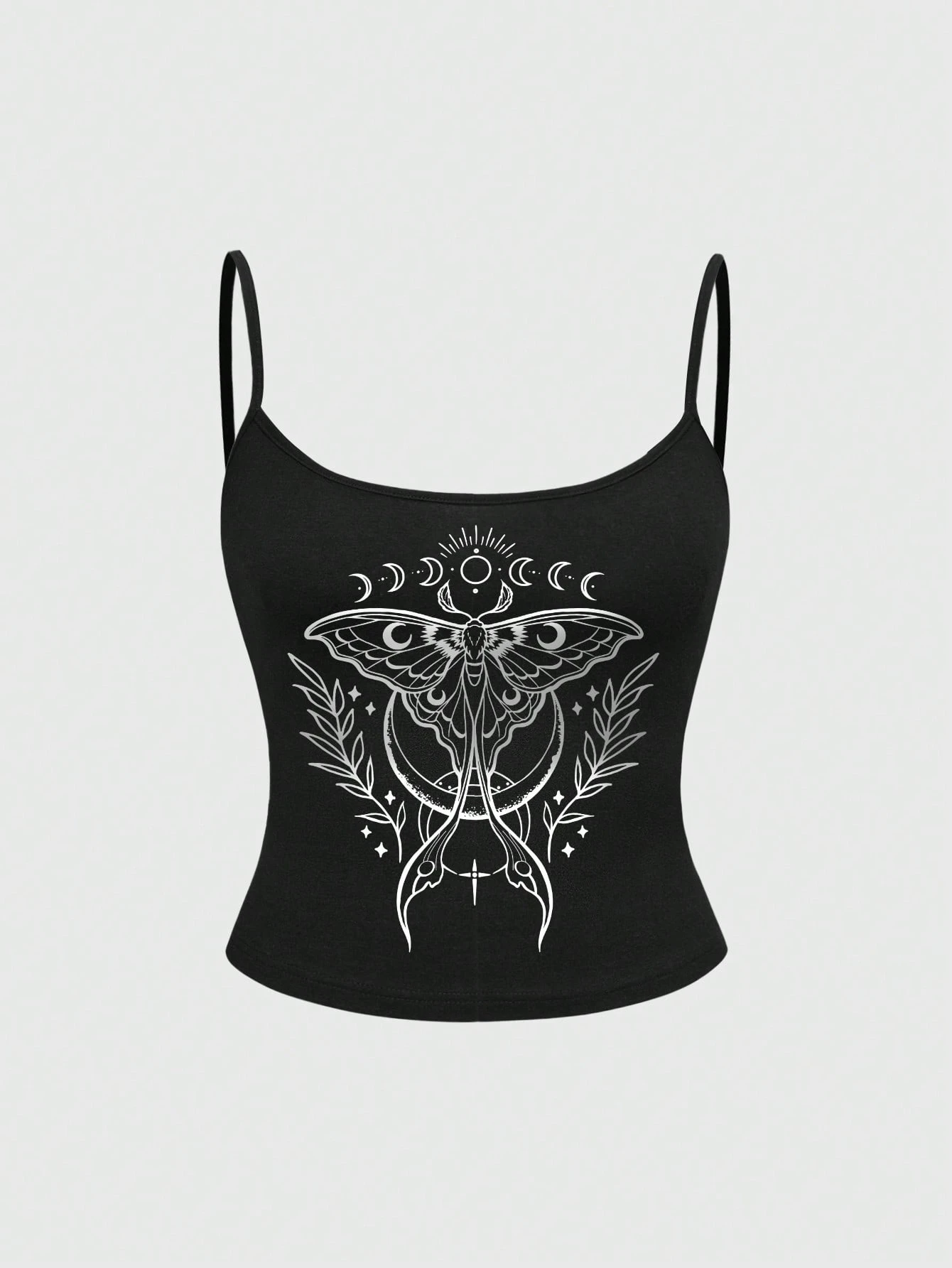 Gothic Vacation Plant Sun Moon Star Butterfly Moth Print Women Tank Top