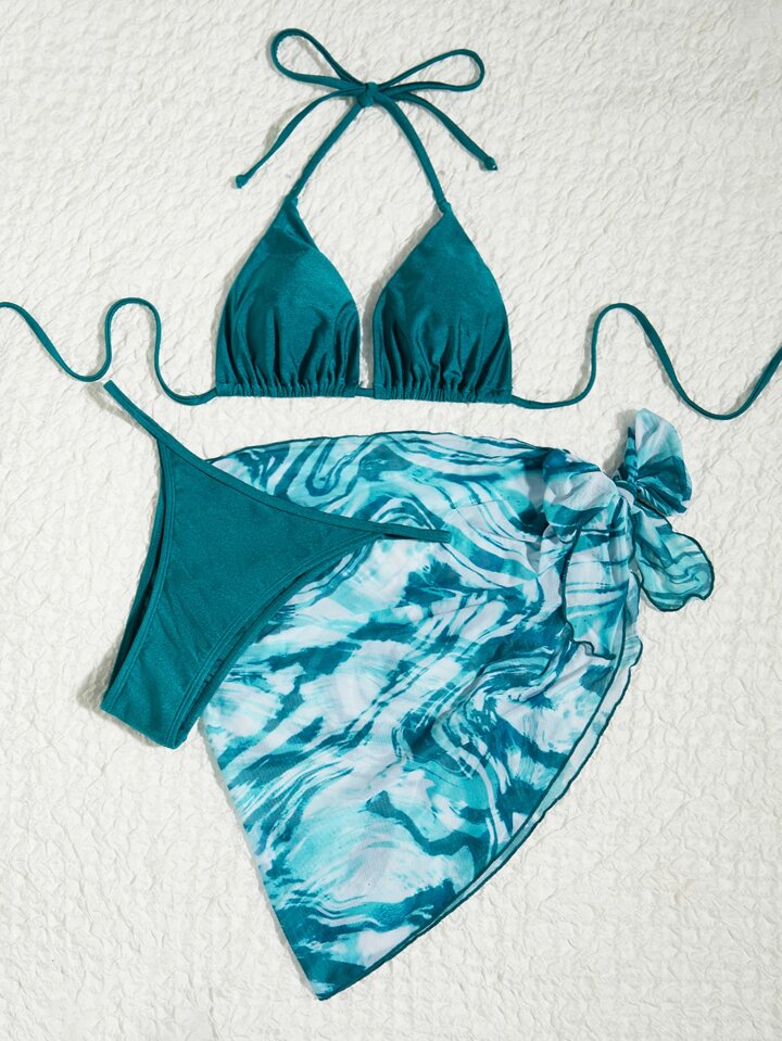Graphic Print Halter Triangle Summer Beach Bikini With Beach Skirt