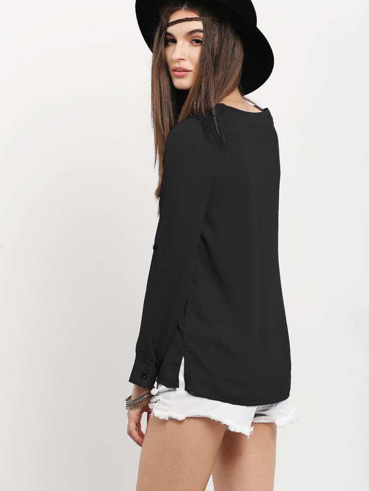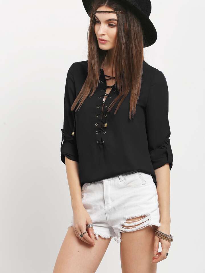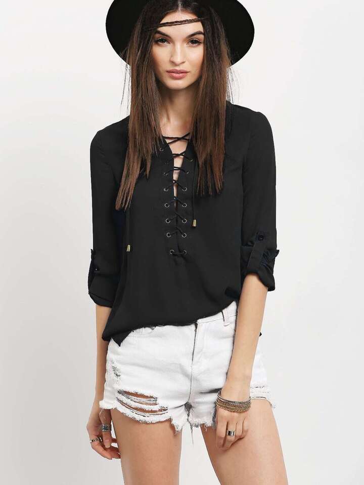 Grommet Lace-Up Roll Tab Sleeve Blouse