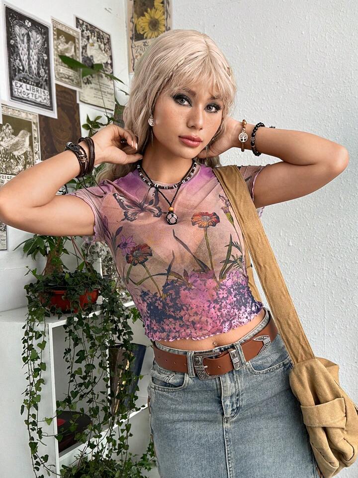 Grunge Floral & Butterfly Print Lettuce Trim Mesh Top Without Bra