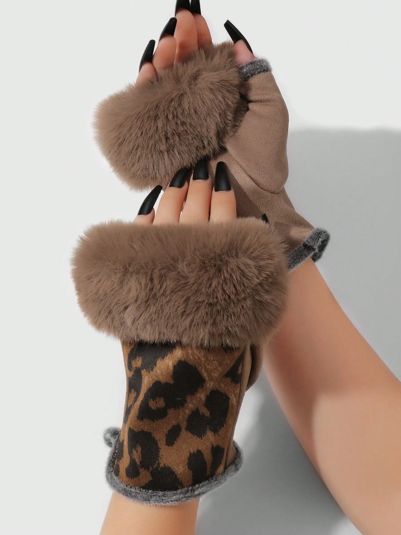 Grunge Punk 1 Pair Chic & Stylish Leopard Print Fuzzy Fingerless Gloves, Touchscreen Capable For Office/Typing, Fashionable Accessory For Women, Gift Box Packaging, For Winter
