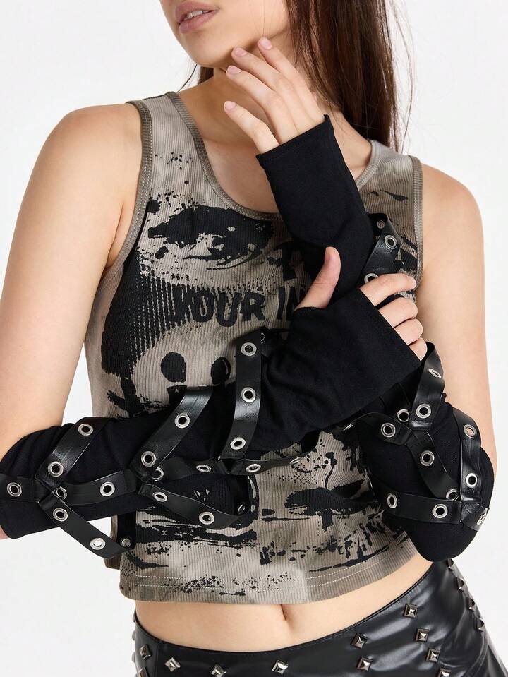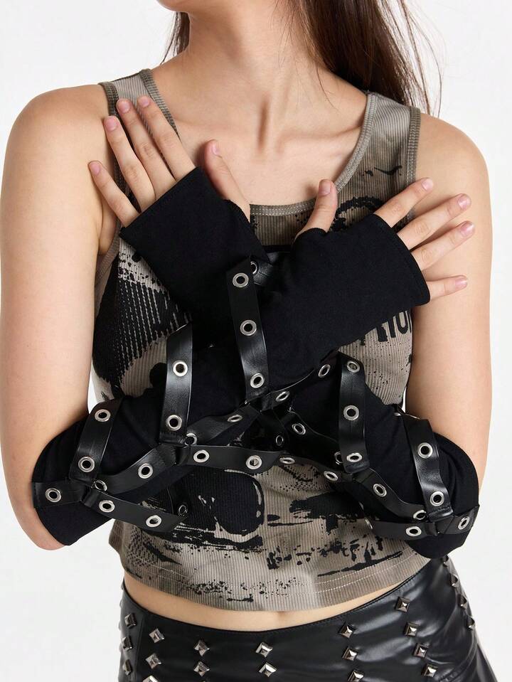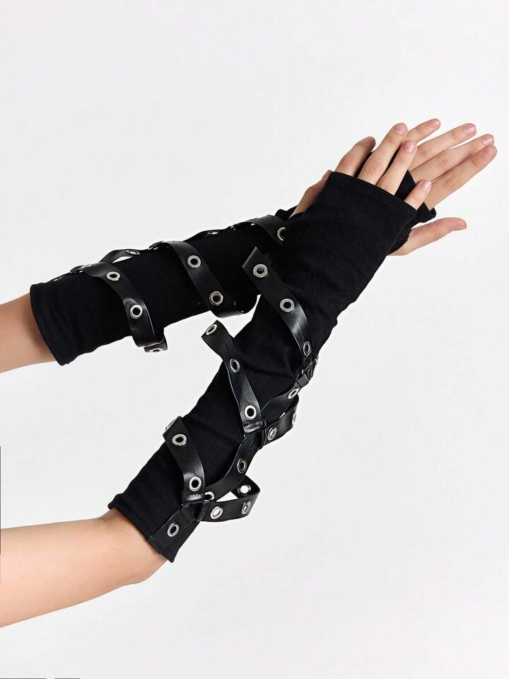 Grunge Punk 1 Pair Punk Rivet Decor Faux Leather Lace-Up Long Gloves, Y2K Style Solid Black Arm Sleeves, Party Gloves, Daily UV Protection Sleeve