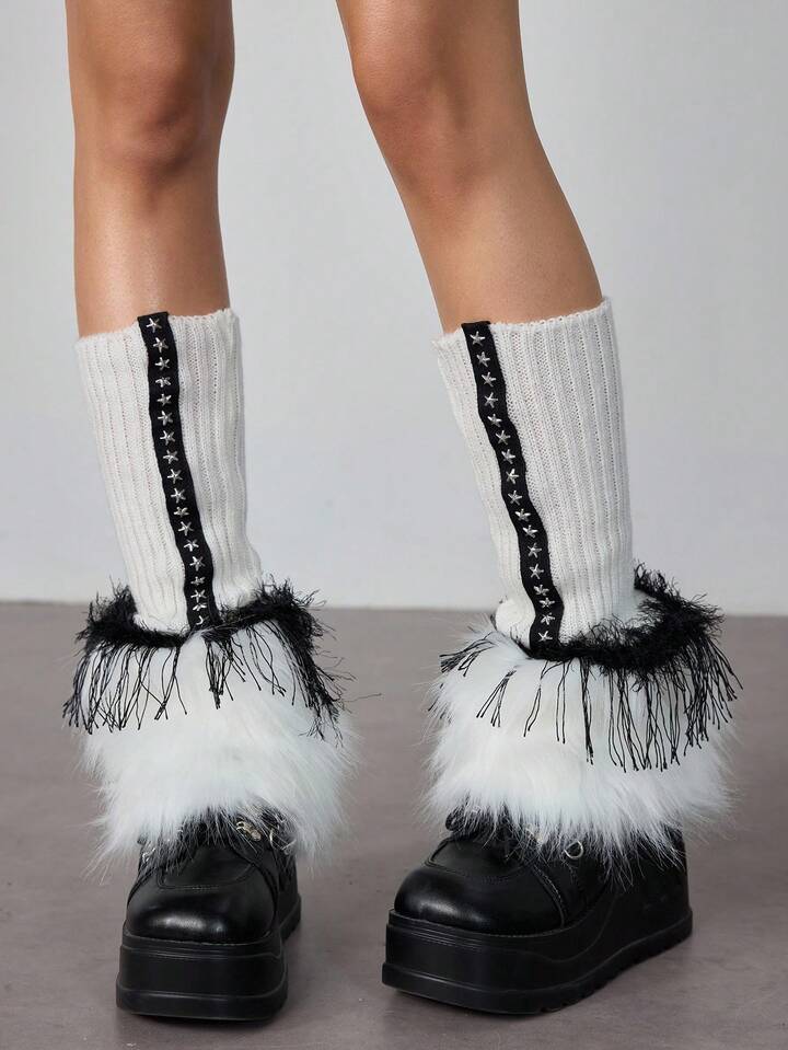 Grunge Punk 1 Pair Punk Style White Solid Color Leg Warmers With Y2K Star Stud Design, Leg Warmers With Furry Patchwork, & Slimming, Suitable For Daily Wear, Holidays, Party Outfit