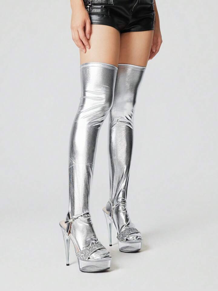 Grunge Punk 1 Pair Women Goth-Style Silver Patent Leather Thigh High Socks, Suitable For All Seasons