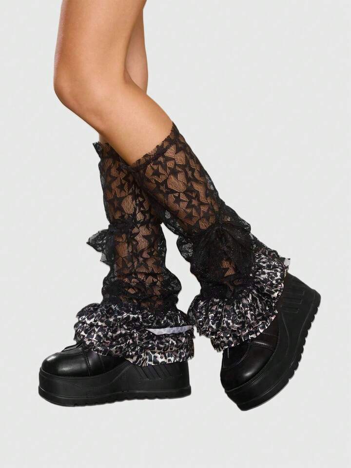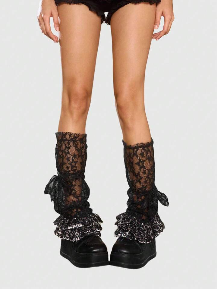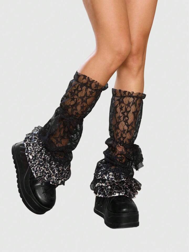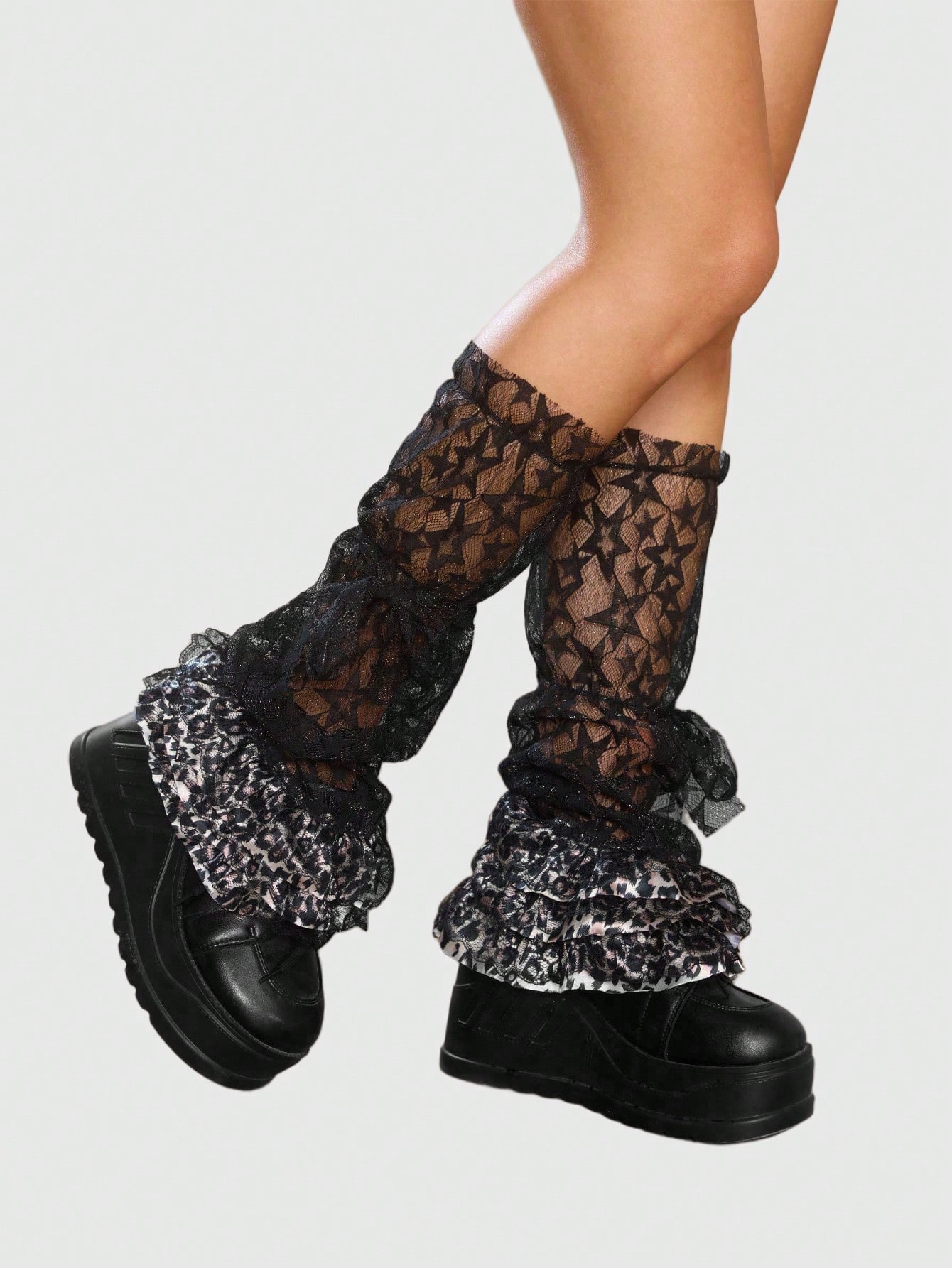 Grunge Punk 1 Pair Y2K Inspired Leopard Print Lace Leg Warmers With Strap, Multi-Layer Ruffle Animal Print Lace Trim Stockings, Personalized Subculture Lace Patchwork Organza Leg Warmers