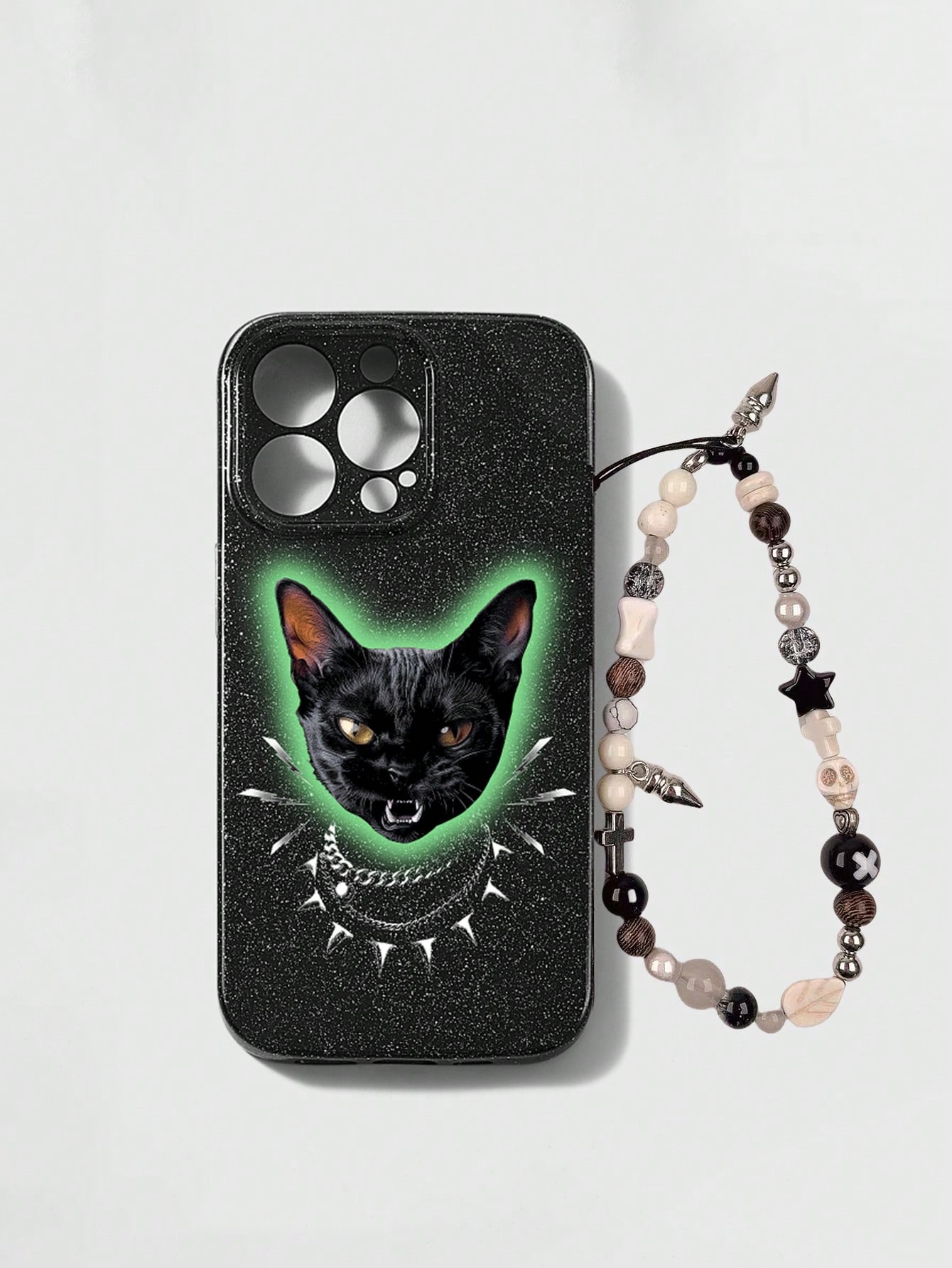 Grunge Punk 1 Pc Black Cat Print Black Phone Case & Gothic Style Bracelet, Compatible With IPhone Apple 11, 12, 13, 14, 15 Pro Max, 16