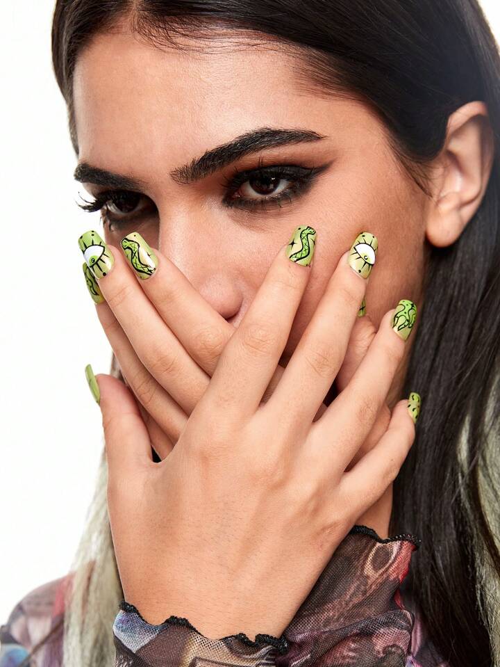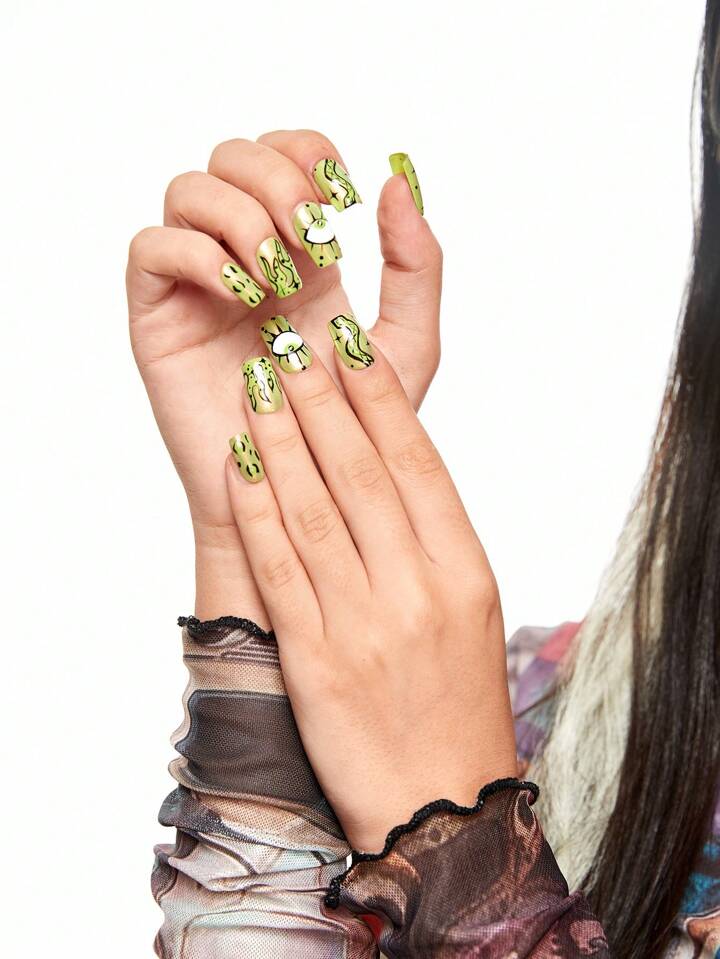 Grunge Punk 10pcs Halloween Dark Gothic Style Green Iridescent Ombre Nail Applique Stickers + 3pcs Double-Sided Adhesive, Removable Punk DIY Nail Art Decals With Mystical Hand-Drawn Pattern, High-Gloss Reusable False Nails For Festival, Party, Dance And Daily Wear