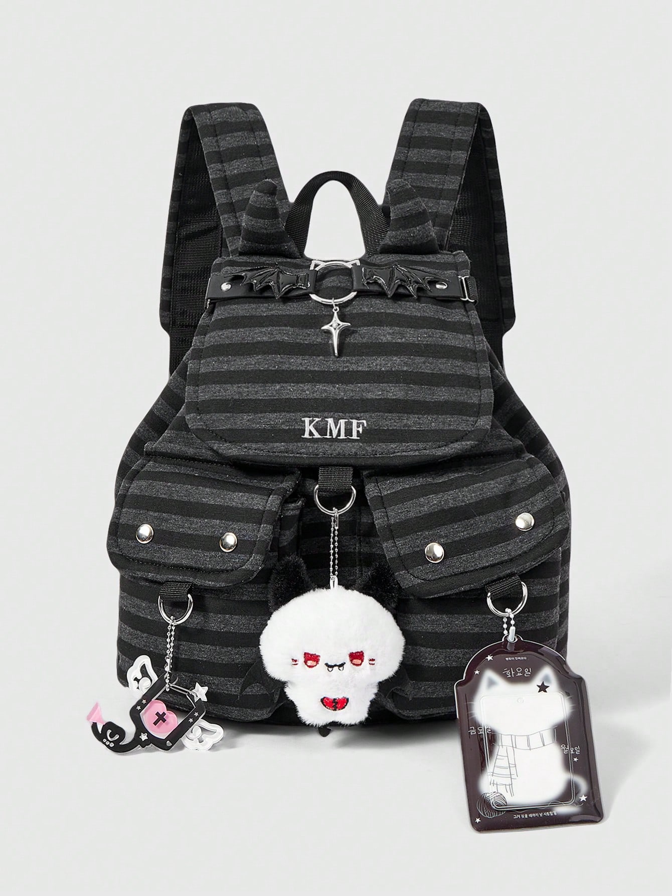 Grunge Punk 1Pc Punk Academy Style Adjustable Wing Cross With Wings Cat Mountaineering Buckle Wings Love Pendant Cat Card Cover Design Dark Striped Backpack, Fashionable And Casual Unisex Large Capacity Backpack Suitable For Commuting, School, Travel, Etc