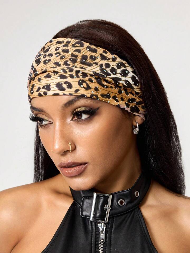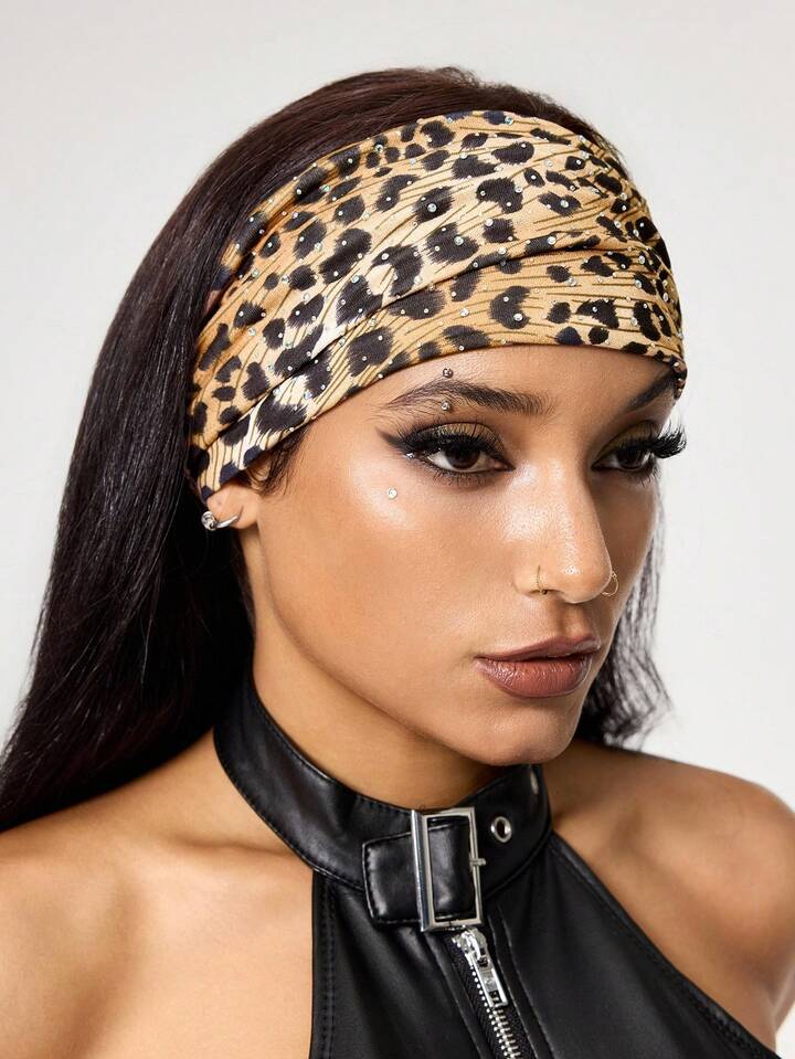 Grunge Punk 1pc Fashion Double Laser Holographic Rhinestone Wide Headband, Flexible Leopard Print Idol Style Headwrap, Versatile Daily Hairband