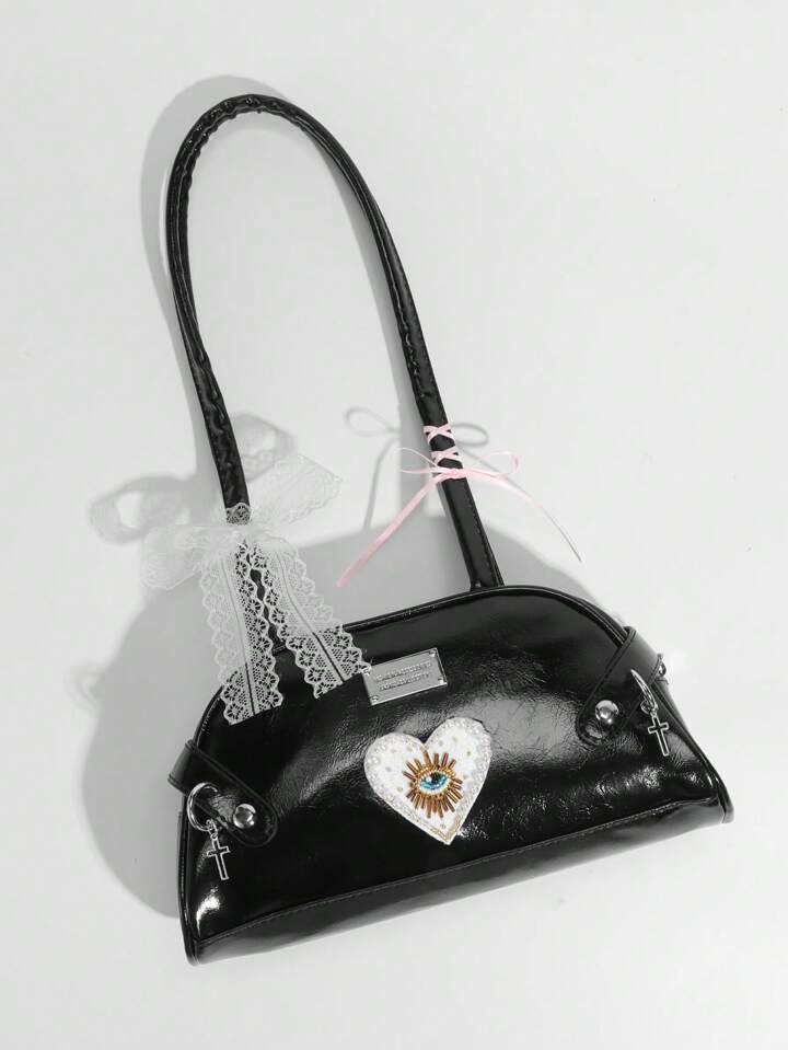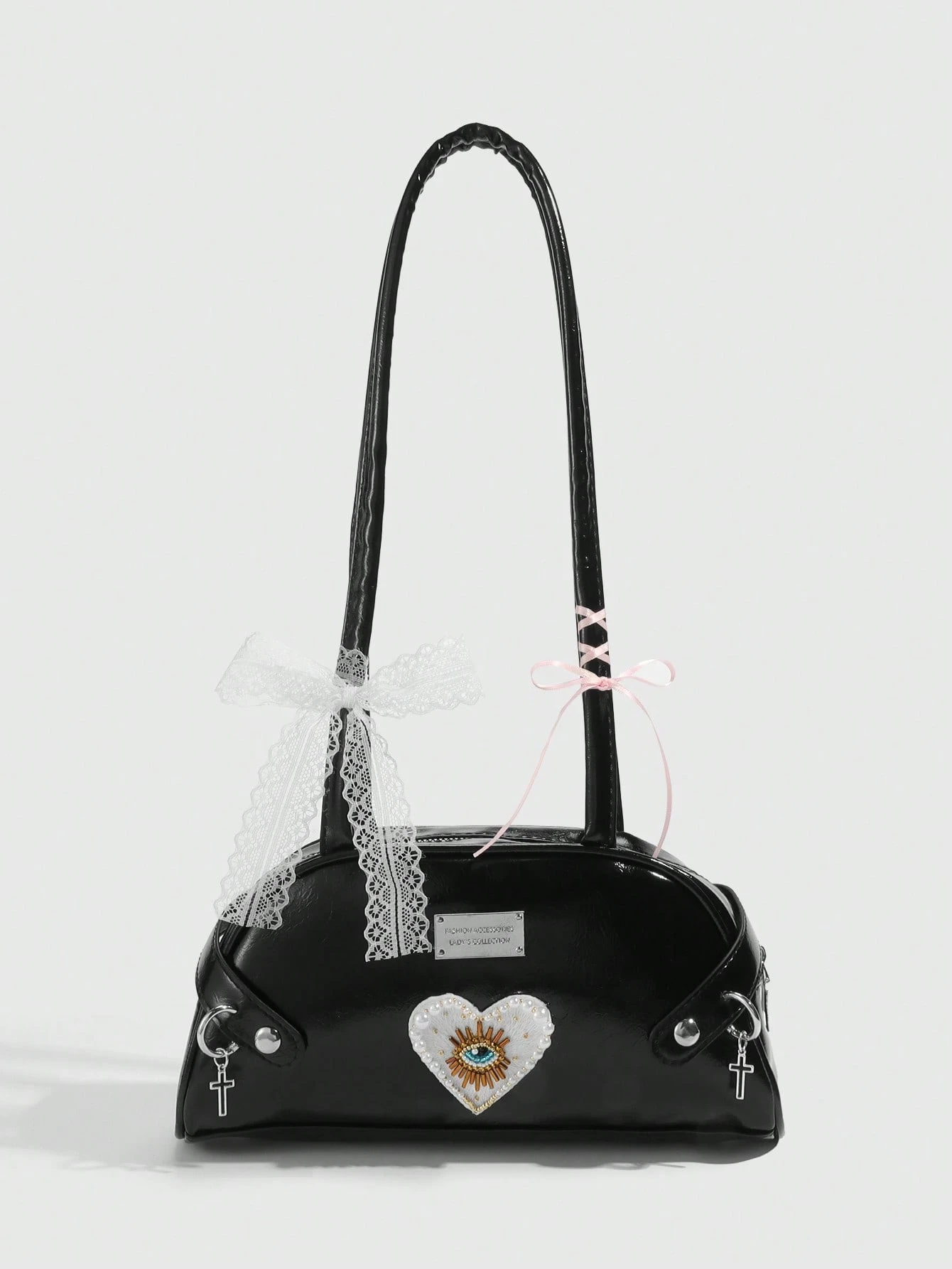 Grunge Punk 1pc Gothic Devil's Eye PU Leather Black Crossbody Bag For Women, Bowknot Decor Dumpling Shape Bowling Bag