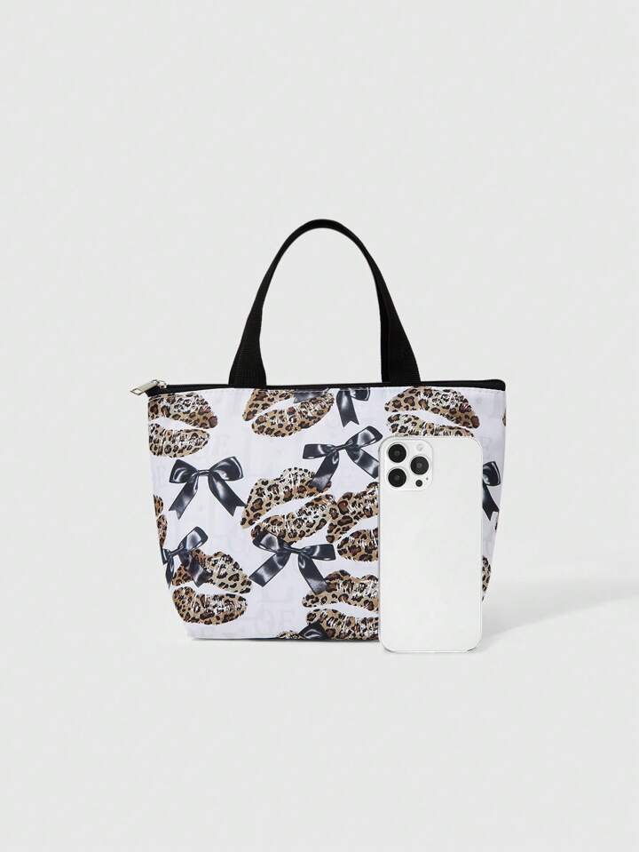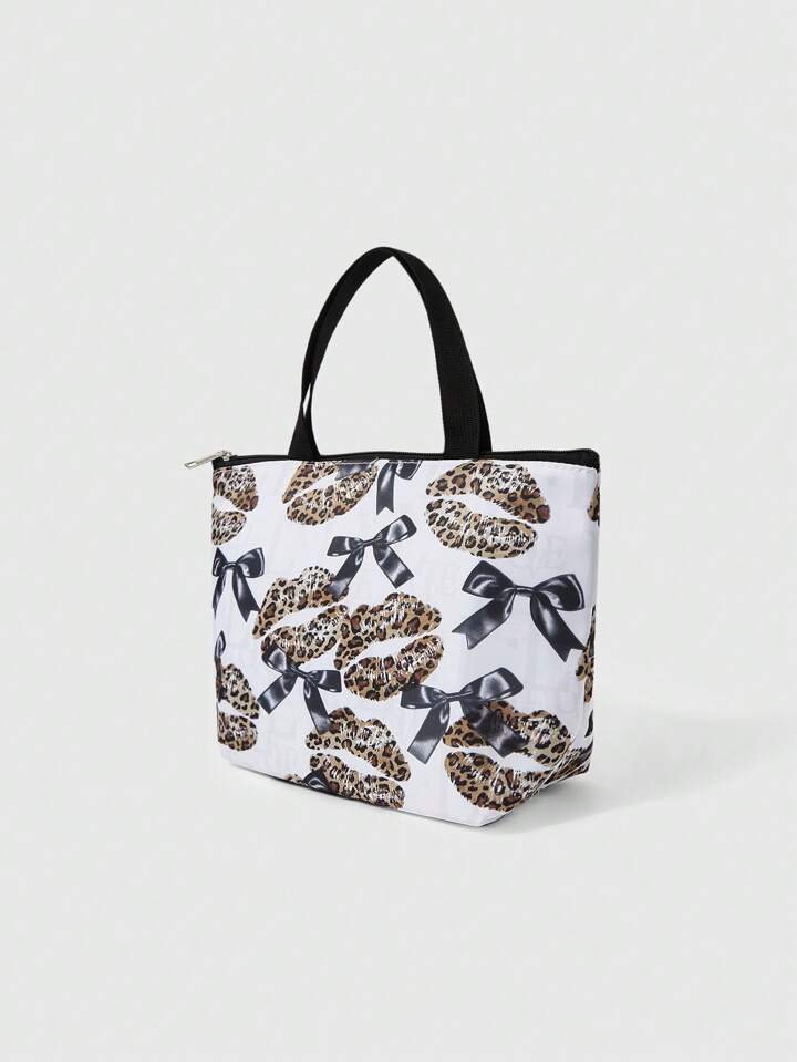 Grunge Punk 1pc Leopard Bow Lip Print Insulated Lunch Bag, Waterproof, Suitable For Picnic, Travel, Party, School, Office Lunch Use