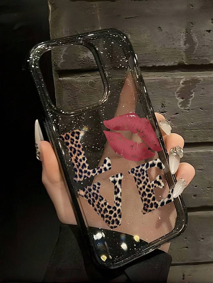 Grunge Punk 1pc Leopard Print Love Pattern Glitter Transparent Phone Case Compatible With Apple